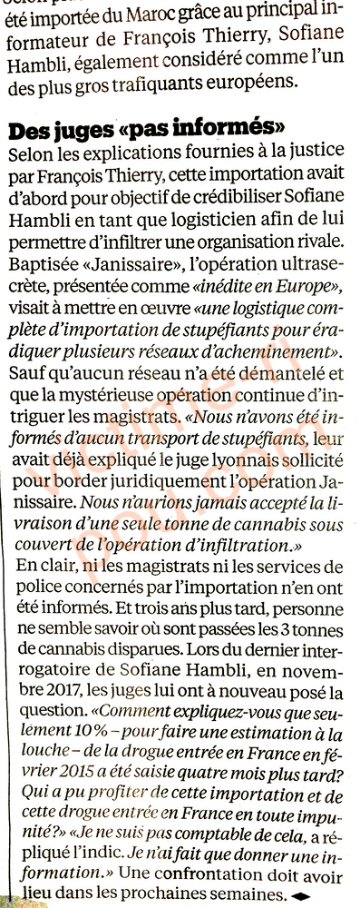 Selon les explications fournies à la justice par François Thierry, cette importation avait d'abord pour objectif de crédibiliser Sofiane Hambli en tant que logisticien afin de lui permettre d'infiltrer une organisation rivale. Baptisée «Janissaire», l'opération ultra secrète, présentée comme « inédite en Europe », visait à mettre en ouvre « une logistique complète d'importation de stupéfiants pour éradiquer plusieurs réseaux d'acheminement ». Sauf qu'aucun réseau n'a été démantelé et que la mystérieuse opération continue d'intriguer les magistrats. « Nous n'avons été informés d'aucun transport de stupéfiants, leur avait déjà expliqué le juge lyonnais sollicité pour border juridiquement l'opération Janissaire. Nous n'aurions jamais accepté la livraison d'une seule tonne de cannabis sous couvert de l'opération d'infiltration.»