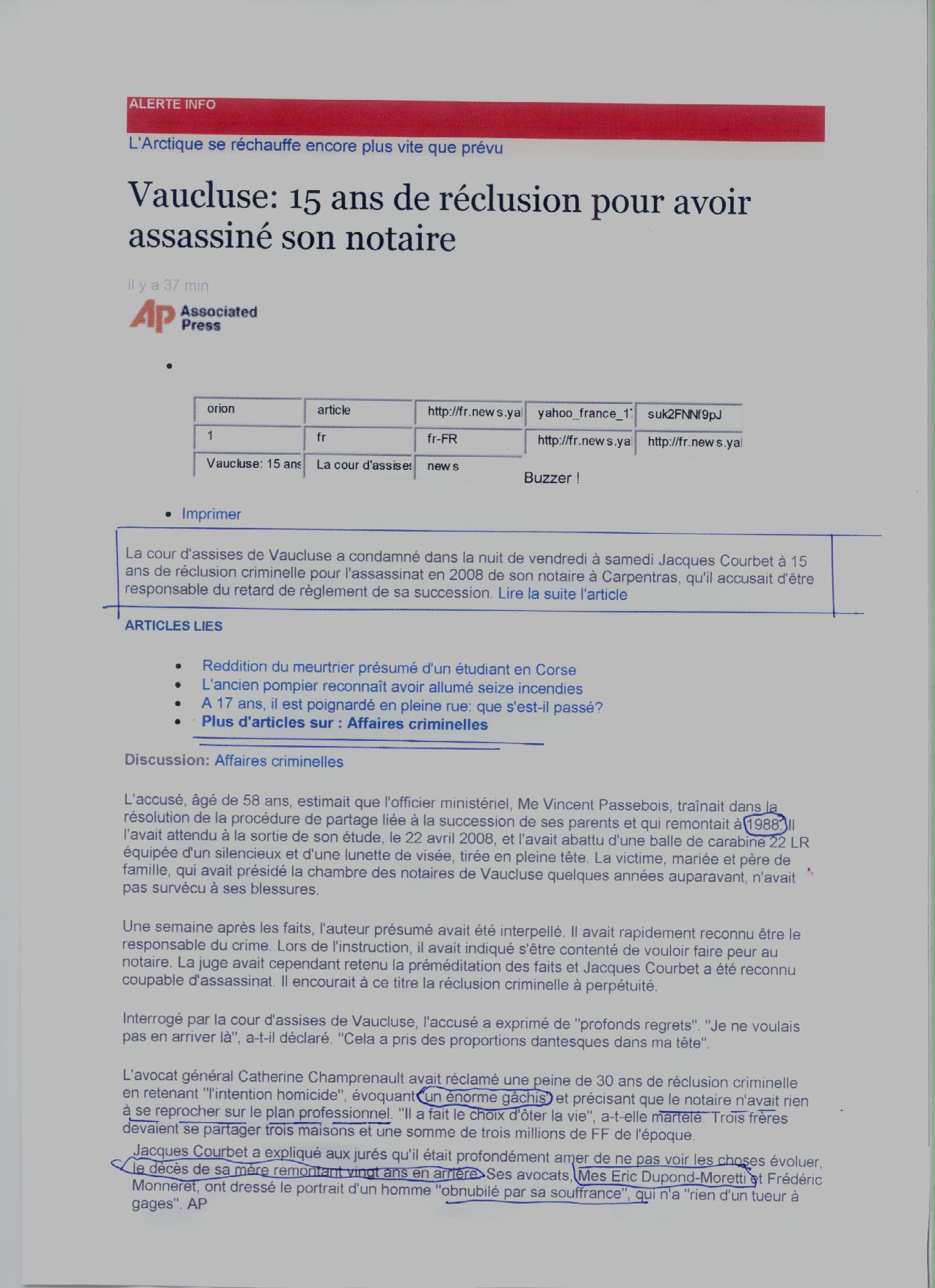 La cour d'assises de Vaucluse a condamné dans la nuit de vendredi à samedi Jacques Courbet à 15 ans de réclusion criminelle pour l'assassinat en 2008 de son notaire à Carpentras qu'il accusait d'être responsable du retard de règlement de sa succession