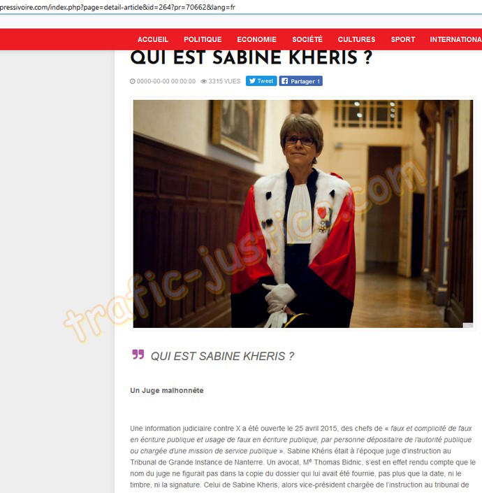 Retranscription de l'article ci-dessus : Un Juge malhonnête Une information judiciaire contre X a été ouverte le 25 avril 2015, des chefs de « faux et complicité de faux en écriture publique et usage de faux en écriture publique, par personne dépositaire de l'autorité publique ou chargée d'une mission de service publique ». Sabine Khéris était à l'époque juge d'instruction au Tribunal de Grande Instance de Nanterre. Un avocat, Me Thomas Bidnic, s'est en effet rendu compte que le nom du juge ne figurait pas dans la copie du dossier qui lui avait été fournie, pas plus que la date, ni le timbre, ni la signature. Celui de Sabine Kheris, alors vice-président chargée de l'instruction au tribunal de Nanterre, aurait été, selon lui, ajouté par la suite. En somme, le juge d'instruction aurait enquêté hors de tout cadre légal. Et cela frappait de nullité tous les actes qu'elle avait posés.