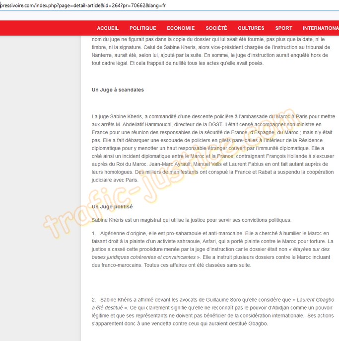 Un Juge politisé Sabine Khéris est un magistrat qui utilise la justice pour servir ses convictions politiques. 1. Algérienne d'origine, elle est pro-saharaouie et anti-marocaine. Elle a cherché à humilier le Maroc en faisant droit à la plainte d'un activiste sahraouie, Asfari, qui a porté plainte contre le Maroc pour torture. La justice a cassé cette procédure menée par la juge d'instruction car le dossier était non « étayées sur des bases juridiques cohérentes et convaincantes ». Elle a instruit plusieurs dossiers contre le Maroc incluant des franco-marocains. Toutes ces affaires ont été classées sans suite. 2. Sabine Khéris a affirmé devant les avocats de Guillaume Soro qu'elle considère que « Laurent Gbagbo a été destitué ». Ce qui clairement signifie qu'elle ne reconnaît pas le pouvoir d'Abidjan comme un pouvoir légitime et que ses représentants ne doivent pas bénéficier de la considération internationale. Ses actions s'apparentent donc à une vendetta contre ceux qui auraient destitué Gbagbo.