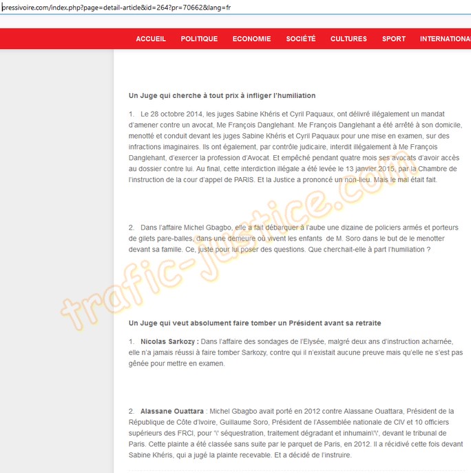 Un Juge qui veut absolument faire tomber un Président avant sa retraite 1. Nicolas Sarkozy : Dans l'affaire des sondages de l'Elysée, malgré deux ans d'instruction acharnée, elle n'a jamais réussi à faire tomber Sarkozy, contre qui il n'existait aucune preuve mais qu'elle ne s'est pas gênée pour mettre en examen. 2. Alassane Ouattara : Michel Gbagbo avait porté en 2012 contre Alassane Ouattara, Président de la République de Côte d'Ivoire, Guillaume Soro, Président de l'Assemblée nationale de CIV et 10 officiers supérieurs des FRCI, pour '\' séquestration, traitement dégradant et inhumain\'\', devant le tribunal de Paris. Cette plainte a été classée sans suite par le parquet de Paris, en 2012. Il a récidivé cette fois devant Sabine Khéris, qui a jugé la plainte recevable. Et a décidé de l'instruire.