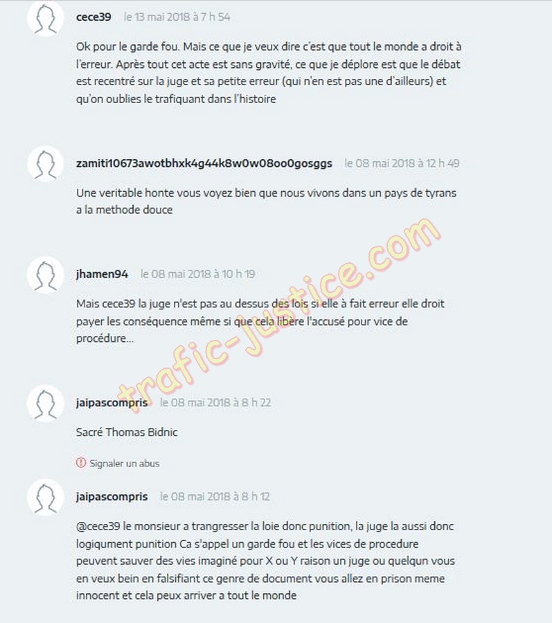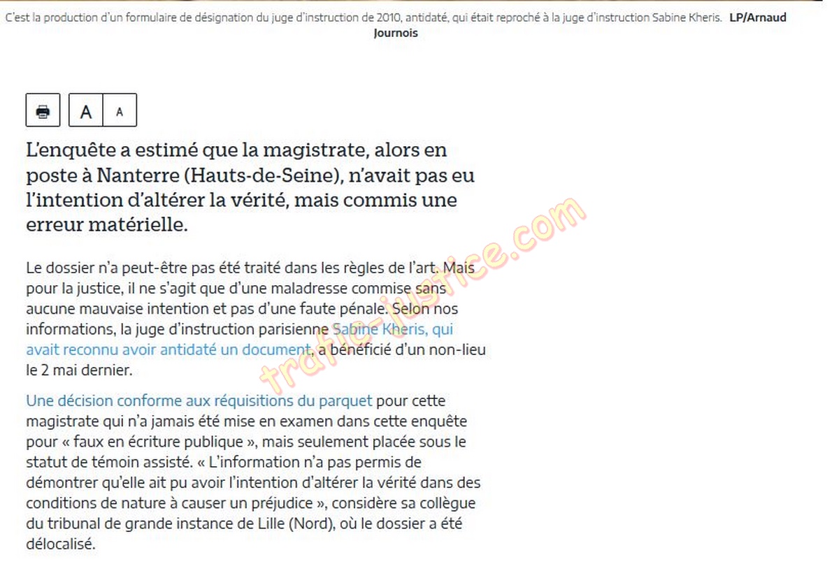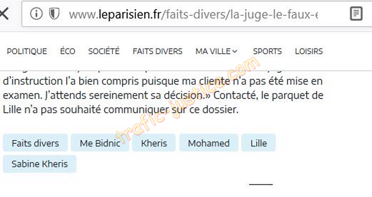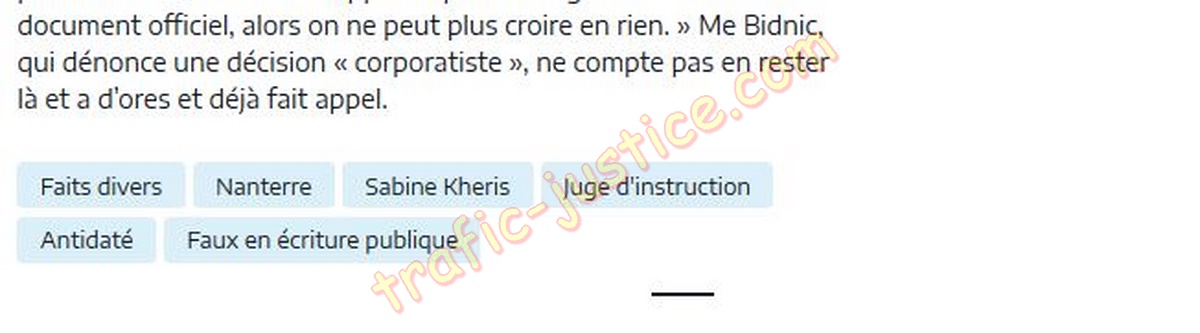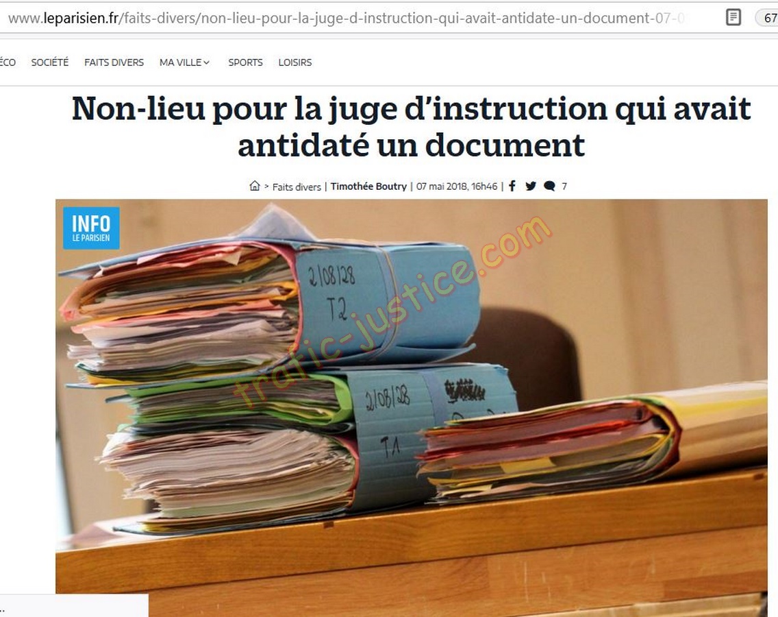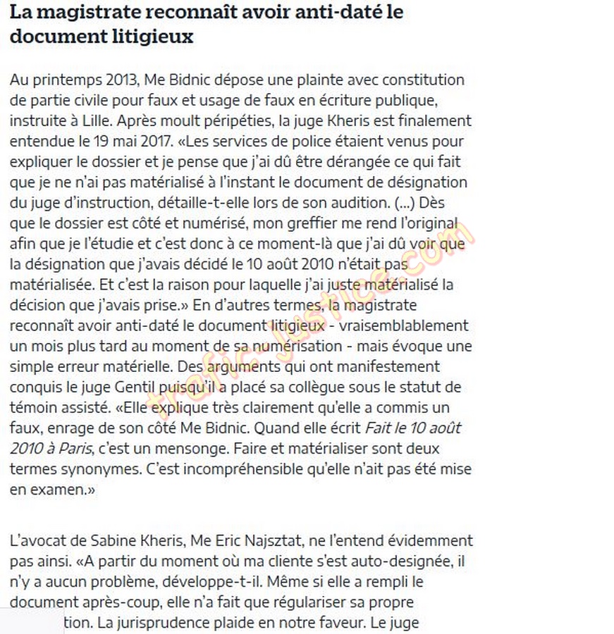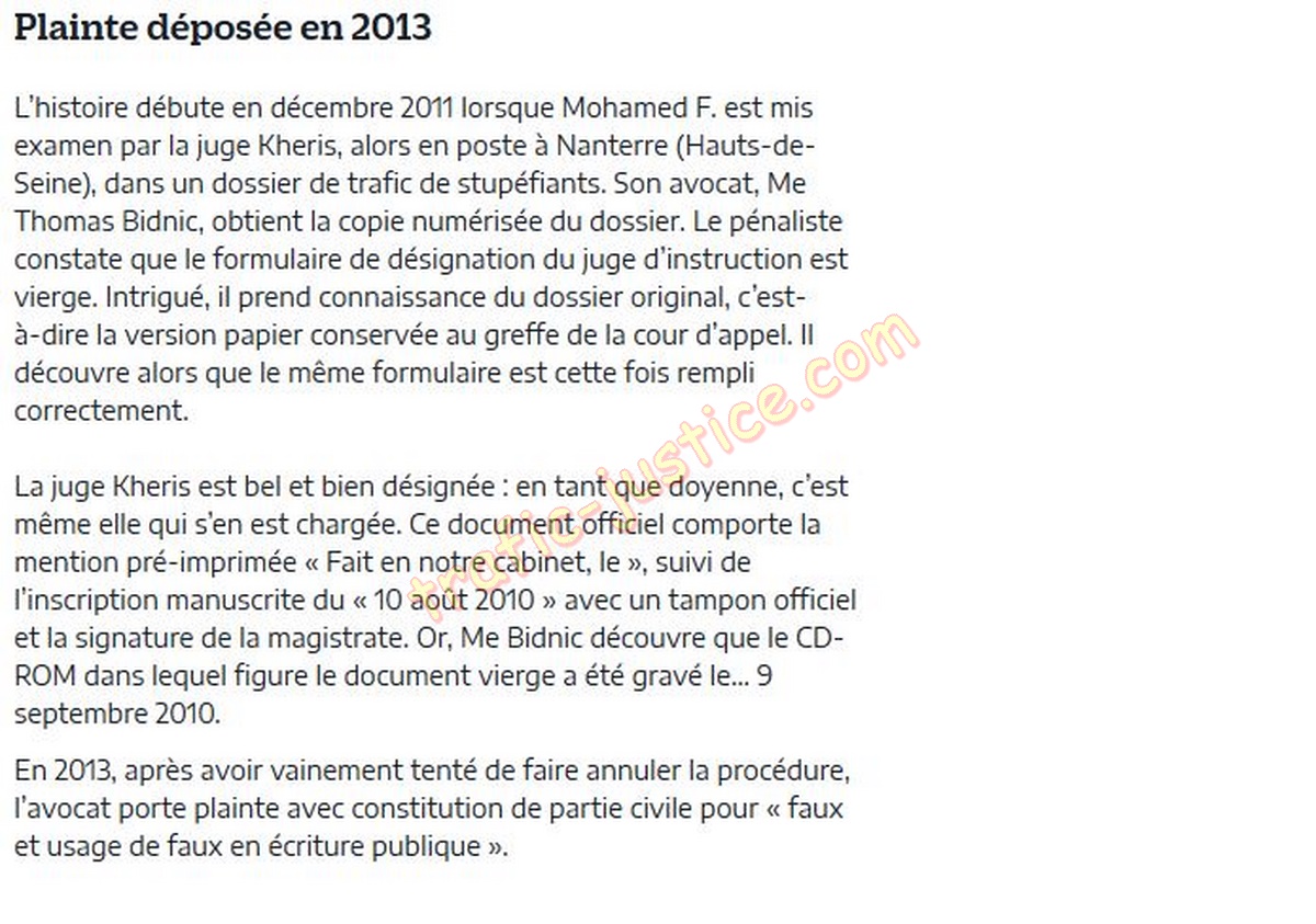 | Ci-dessous, sanction ? Non-lieu ! La suite en 2019 ? Un avocat ose signaler le faux de la juge Sabine Kheris - Erreur bien sûr ? Dans le cas de René FORNEY, le pot de vin de 80.000 euros à un notaire est masqué par toutes les magouilles possibles comme 8 mois en prison après 48 heures de menaces en garde à vue pour obtenir le retrait des dérives signalées sur les sites internet. Un juge signale ces dérives : http://www.juge-domergue.fr.ht/ (extraits) |