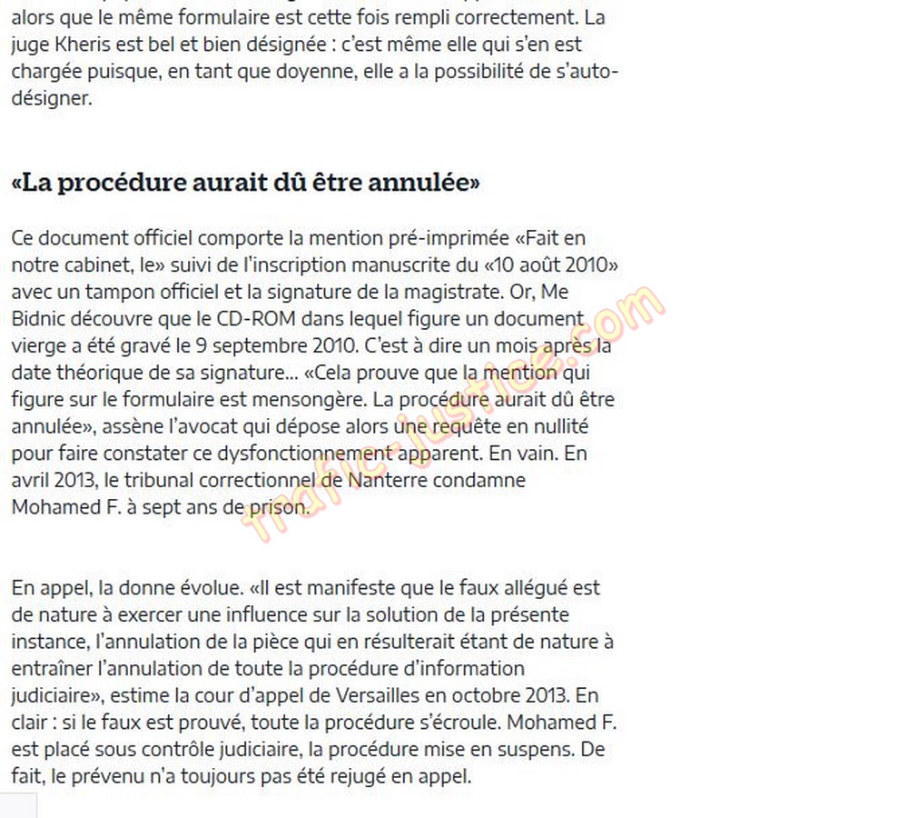 «La procédure aurait dû être annulée» Ce document officiel comporte la mention pré-imprimée «Fait en notre cabinet, le» suivi de l'inscription manuscrite du «10 août 2010» avec un tampon officiel et la signature de la magistrate. Or, Me Bidnic découvre que le CD-ROM dans lequel figure un document vierge a été gravé le 9 septembre 2010. C'est à dire un mois après la date théorique de sa signature... «Cela prouve que la mention qui figure sur le formulaire est mensongère. La procédure aurait dû être annulée», assène l'avocat qui dépose alors une requête en nullité pour faire constater ce dysfonctionnement apparent. En vain. En avril 2013, le tribunal correctionnel de Nanterre condamne Mohamed F. à sept ans de prison. En appel, la donne évolue. «Il est manifeste que le faux allégué est de nature à exercer une influence sur la solution de la présente instance, l'annulation de la pièce qui en résulterait étant de nature à entraîner l'annulation de toute la procédure d'information judiciaire», estime la cour d'appel de Versailles en octobre 2013. En clair : si le faux est prouvé, toute la procédure s'écroule. Mohamed F. est placé sous contrôle judiciaire, la procédure mise en suspens. De fait, le prévenu n'a toujours pas été rejugé en appel. La magistrate reconnaît avoir anti-daté le document litigieux Au printemps 2013, Me Bidnic dépose une plainte avec constitution de partie civile pour faux et usage de faux en écriture publique, instruite à Lille. Après moult péripéties, la juge Kheris est finalement entendue le 19 mai 2017. «Les services de police étaient venus pour expliquer le dossier et je pense que j'ai dû être dérangée ce qui fait que je ne n'ai pas matérialisé à l'instant le document de désignation du juge d'instruction, détaille-t-elle lors de son audition. (...) Dès que le dossier est côté et numérisé, mon greffier me rend l'original afin que je l'étudie et c'est donc à ce moment-là que j'ai dû voir que la désignation que j'avais décidé le 10 août 2010 n'était pas matérialisée. Et c'est la raison pour laquelle j'ai juste matérialisé la décision que j'avais prise.» En d'autres termes, la magistrate reconnaît avoir anti-daté le document litigieux - vraisemblablement un mois plus tard au moment de sa numérisation - mais évoque une simple erreur matérielle. Des arguments qui ont manifestement conquis le juge Gentil puisqu'il a placé sa collègue sous le statut de témoin assisté. «Elle explique très clairement qu'elle a commis un faux, enrage de son côté Me Bidnic. Quand elle écrit Fait le 10 août 2010 à Paris , c'est un mensonge. Faire et matérialiser sont deux termes synonymes. C'est incompréhensible qu'elle n'ait pas été mise en examen.» L'avocat de Sabine Kheris, Me Eric Najsztat, ne l'entend évidemment pas ainsi. «A partir du moment où ma cliente s'est auto-designée, il n'y a aucun problème, développe-t-il. Même si elle a rempli le document après-coup, elle n'a fait que régulariser sa propre désignation. La jurisprudence plaide en notre faveur. Le juge d'instruction l'a bien compris puisque ma cliente n'a pas été mise en examen. J'attends sereinement sa décision.» Contacté, le parquet de Lille n'a pas souhaité communiquer sur ce dossier. © Le Parisien |