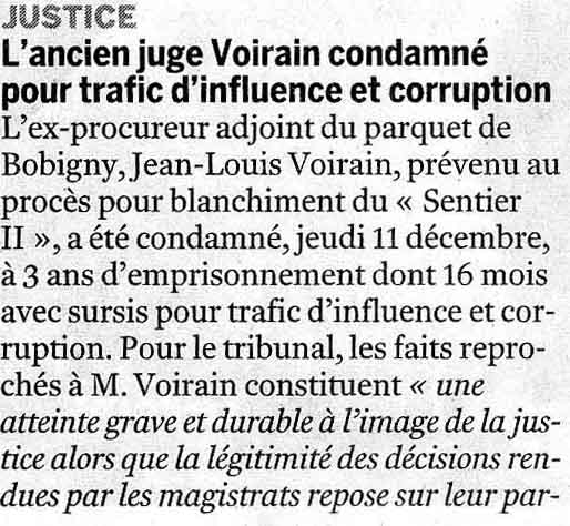 Justice : L'ex-procureur adjoint du parquet de Bobigny, Jean-Louis Voirain, prévenu au procès pour blanchiment du « Sentier II », a été condamné, jeudi 11 décembre, à 3 ans d'emprisonnement dont 16 mois avec sursis pour trafic d'influence et corruption. Pour le tribunal, les faits reprochés à M. Voirain constituent « une atteinte grave et durable à l'image de la justice alors que la légitimité des décisions rendues par les magistrats repose sur leur partialité |