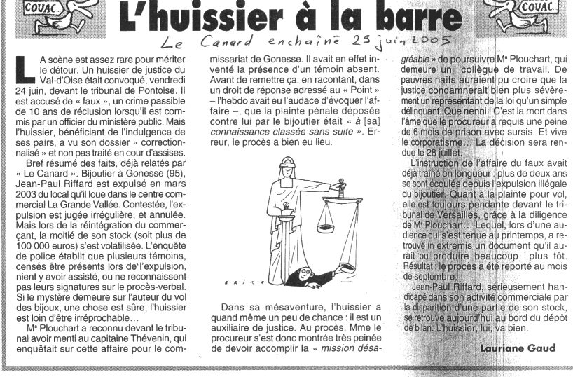" ... huissier de justice ... tribunal de Pontoise ... accusé de faux ... crime passible de 10 ans ... indulgence de ses pairs ... Bijoutier de Gonesse (95) Jean-Paul Riffard est expulsé en mars 2003 du local qu'il loue dans le centre commercial La Grande Vallée ... vol des bijoux ... 100 000 euros ... volatilisés ... l'huissier est loin d'être irréprochable ... Me PLOUCHARD ... menti au capitaine Thévenin, qui enquêtait ...auxiliaire de justice. Au procès, Mme le procureur s'est donc montrée très peinée de devoir accomplir la mission désagréable de poursuivre Plouchard ... collègue de travail. De pauvres naïfs auraient pu croire que la justice condamnerait bien plus sévèrement un représentant de la loi ... 6 mois de prison avec sursis ...