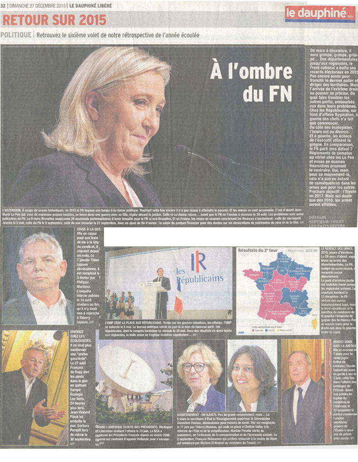 | L'ASCENSION. À coups de scores historiques, en 2015 le FN impose son tempo à la classe politique. Pourtant cette fois encore il n'a pas réussi à atteindre le pouvoir. Et les ennuis se sont accumulés. C'est d'abord Jean-Marie Le Pen qui, avec de nouveaux propos racistes, se lance dans une guerre avec sa fille, réglée devant la justice. Celle-ci lui donne raison... avant que le FN ne l'exclue à nouveau le 20 août. Les problèmes sont aussi judiciaires au FN. Le 9 mars Bruxelles soupçonne 20 assistants parlementaires d'avoir travaillé pour le FN et non Bruxelles. Et en France, les mises en examen concernant les finances s'enchaînent : celle du microparti Jeanne le 5 mai, celle du FN le 9 septembre, celle de son trésorier le 21 septembre. Avec un ajout de fin d'année : la saisie du parquet financier pour |