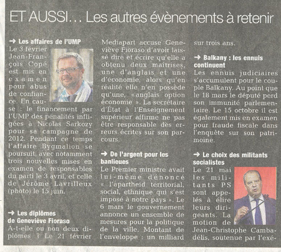 Le 3 février Jean-François Copé est mis en examen pour abus de confiance. En cause : le financement par l'UMP des pénalités infligées à "Nicolas Sarkozy pour sa campagne de 2012. Pendant ce temps l'affaire Bygmalion se poursuit, avec notamment trois nouvelles mises en examen de responsables du parti le 3 avril, et celle de Jérôme Lavrilleux (photo) le 15 juin.