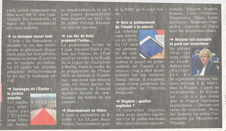 GOUVERNEMENT : ON AJUSTE. Pas de grand remaniement, mais... Le 5 mars la secrétaire d'État à l'Enseignement supérieur, la Grenobloise Genevière Fioraso, démissionne pour raisons de santé. Elle est remplacée le 17 juin par Thierry Mandon, qui cède sa place à Clotilde Valter à la réforme de l'État et de la simplification. Martine Pinville hérite du commerce, de l'artisanat, de la consommation et de l'économie sociale. Le 2 septembre, François Rebsamen qui préfère retourner à la mairie de Dijon est remplacé par Myriam El Khomri au ministère du Travail, afp |