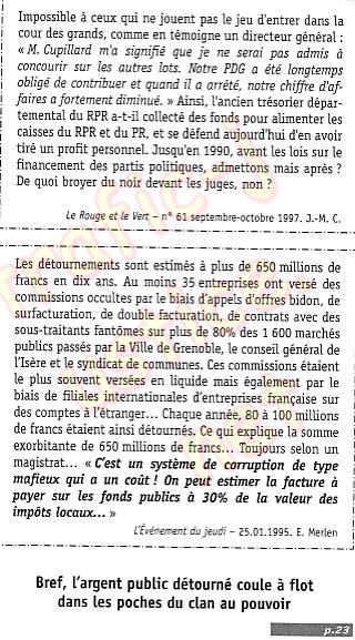 ... M. Cupillard m'a signifié que je ne serai pas admis à concourir sur les autres lots. Notre PDG a été longtemps obligé de contribuer ... Ainsi, l'ancien trésorier départemental du RPR a t-il collecté des fonds pour alimenter les caisses du RPR et du PR ... Les détournements sont estimés à plus de 650 millions de francs en dix ans... C'est un système de corruption de type mafieux qui a un coup... 30 % de la valeurs des impots locaux ...