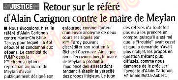 Le Dauphiné Libéré du 12 juin 2007 Etrange association que cette avocate BOTTA ELENA AUBERT ANNIE que je dénonce sur Internet depuis 2003 comme corrompue, et, qui assiste Alain CARIGNON lui aussi condamné à plusieurs années de taule pour corruption. Cette avocate de Grenoble a coulé mon dossier au moment d'un pot de vin de la partie adverse. ? |