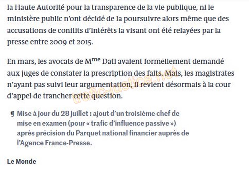 Mise à jour du 28 juillet : ajout d'un troisième chef de mise en examen (pour « trafic d'influence passive ») après précision du Parquet national financier auprès de l'Agence France-Presse.