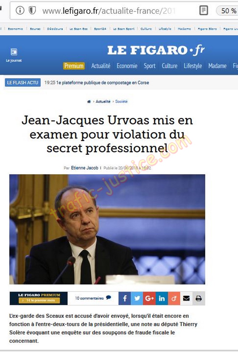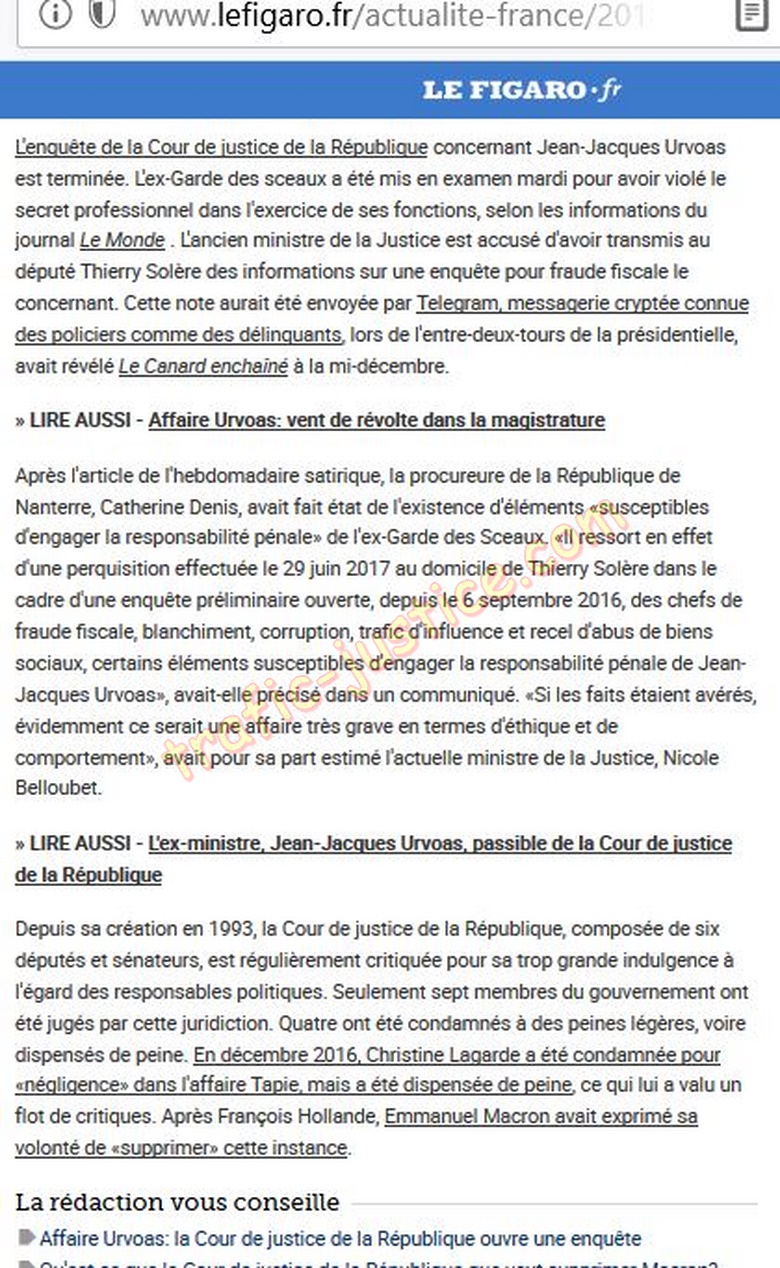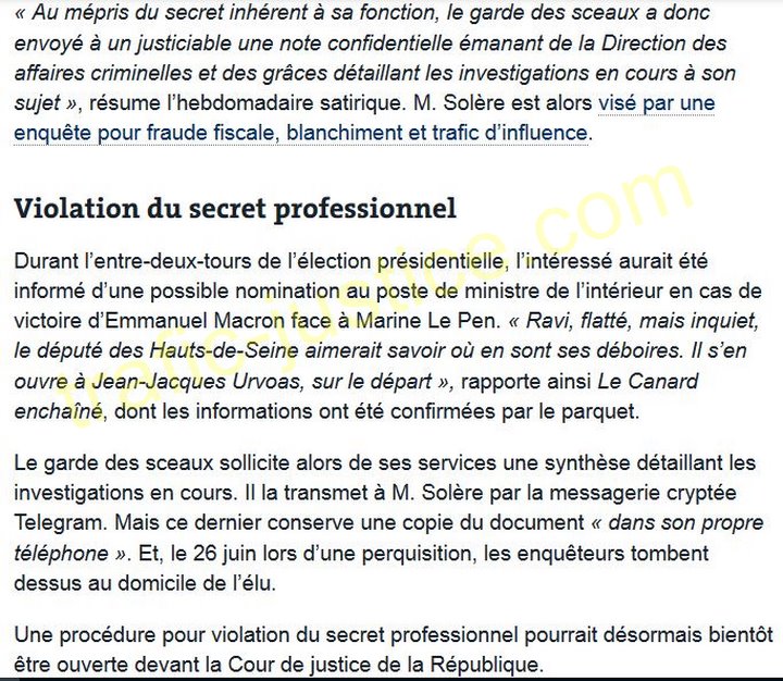 Violation du secret professionnel Durant l'entre-deux- tours de l'élection présidentielle, l'intéressé aurait été informé d'une possible nomination au poste de ministre de l'intérieur en cas de victoire d'Emmanuel Macron face à Marine Le Pen . « Ravi, flatté, mais inquiet, le député des Hauts-de-Seine aimerait savoir où en sont ses déboires. Il s'en ouvre à Jean-Jacques Urvoas, sur le départ », rapporte ainsi Le Canard enchaîné , dont les informations ont été confirmées par le parquet. Le garde des sceaux sollicite alors de ses services une synthèse détaillant les investigations en cours. Il la transmet à M. Solère par la messagerie cryptée Telegram. Mais ce dernier conserve une copie du document « dans son propre téléphone » . Et, le 26 juin lors d'une perquisition, les enquêteurs tombent dessus au domicile de l'élu. Une procédure pour violation du secret professionnel pourrait désormais bientôt être ouverte devant la Cour de justice de la République. Vos réactions (51) Réagir ALLEZ SAVOIR 13/12/2017 - 11h18 Après la permanence parlementaire, on saisit profondément la raison de la réserve (c'est le cas de le dire) vendue comme compétence et éthique, pour l'un ; et pour l'autre, après le douloureux abandon... de LR et de la questure, cette légère supériorité ironique lors des prises de parole médiatiques. Ca fait tache. Deux poids deux mesures 13/12/2017 - 10h40 La censure n'aime pas la vérité, je récidive. Les journalistes sont prompts à dénoncer les violations du secret judiciaire dont ils font commerce à longueur d'articles. Question de perspective probablement, quand c'est eux, c'est moral.. @guig 13/12/2017 - 10h36 Écœurement des policiers ? C'est trop drôle ! Cela fait des décennies que l'institution policière vit en concubinage avec la presse à scandale et que ce petit monde se rend service en circuit fermé pour nuire à tel ou tel sans aucune considération pour la justice, la vraie. JEAN-PIERRE WELEMANE 13/12/2017 - 10h31 Ce qui serait intéressant de savoir, c'est le fond de l'affaire. Benoit B. 13/12/2017 - 11h35 S'il a vraiment fraudé le fisc, comme l'ami Smet de Jupiter, cela ferait une tache de plus sur le lin blanc du soi-disant renouveau macronien. Benoit B. 13/12/2017 - 10h27 Au fait, ou en est cette enquête ? Il a fraudé ou pas ? Quoi qu'il en soit cela ne l'a pas empêché d'être questeur, tiens a-t-il, comme promis, démissionné, puis de parader et donner des leçons dans de nombreuses interviews politiques. Après tout, ce ne sont que des impôts, du vol quoi selon la doxa libérale (pratique d'être « libéral » si c'est pour ne pas payer d'impôt tout en bénéficiant des structures publiques qu'il finance), comme pour les papiers du Paradis ou pour JP Smet ...