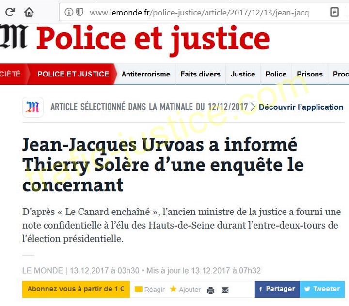 http://www.lemonde.fr/police-justice/article/2017/12/13/jean-jacques-urvoas-a-informe-thierry-solere-d-une-enquete-le-concernant_5228730_1653578.html Jean-Jacques Urvoas a informé Thierry Solère d'une enquête le concernant Article sélectionné dans La Matinale du 12/12/2017 Jean-Jacques Urvoas a informé Thierry Solère d'une enquête le concernant D'après « Le Canard enchaîné », l'ancien ministre de la justice a fourni une note confidentielle à l'élu des Hauts-de-Seine durant l'entre-deux-tours de l'élection présidentielle. LE MONDE | 13.12.2017 à 03h30 • Mis à jour le 13.12.2017 à 07h32 Abonnez vous à partir de 1 € Réagir