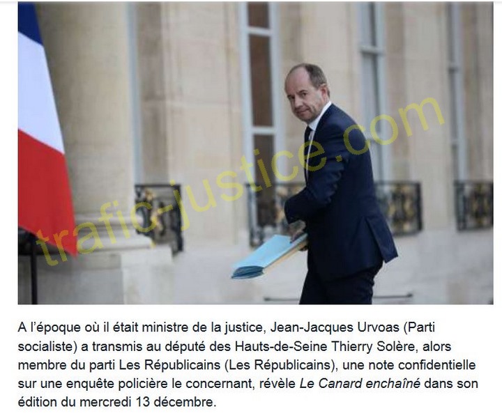 A l'époque où il était ministre de la justice , Jean-Jacques Urvoas ( Parti socialiste ) a transmis au député des Hauts-de-Seine Thierry Solère, alors membre du parti Les Républicains ( Les Républicains ), une note confidentielle sur une enquête policière le concernant, révèle Le Canard enchaîné dans son édition du mercredi 13 décembre.