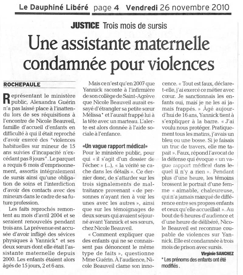 « Tout est faux, déclare t-elle, j'ai exercé ce métier avec cœur. Je sanctionnais les enfants oui, mais je ne les ai jamais frappés. » Âgé aujour d'hui de 16 ans, Yannick tient à s'expliquer à la barre. « J'ai voulu nous protéger. Pratique ment tous les matins, j'avais un bleu ou une bosse. Si je faisais un truc de travers, elle me ta pait ». Faux, répond l'avocat de la défense qui évoque un vague rapport médical dans lequel il n'y a rien. Pendant plus d'une heure, les témoins brossent le portrait d'une femme aimable, chaleureuse, qui n'a jamais marqué rte différence entre ses propres enfants et ceux qu'elle accueillait ». Au bout de 6 heures d'audience et d'une heure de délibéré, Nicole Beauveil est reconnue coupable de violence sur Yannick. Elle est condamnée à trois mois de prison avec sursis. Virginie SANCHEZ Les prénoms des enfants ont été modifiés.