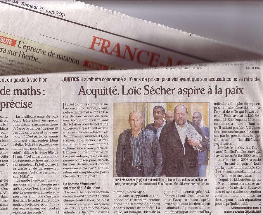 | Source le Dauphiné page 34 du 25/06/11 : Accusé de viol par une gamine, et, la justice expéditive incapable de vérifier la réalité des faits ( ! ) Envoie Loïc SECHER en prison pendant 7 ans avant d'accepter de reconnaitre ses erreurs 11 ans plus tard. Texte recopié ci-dessous Pendant 13 ans, de la même façon, 200 magistrats (avec les preuves en mains 1, 15, 22) ont validé trois jugements successifs à mon encontre sans les pièces de ma défense faisant suite aux trahisons de mes avocats. |