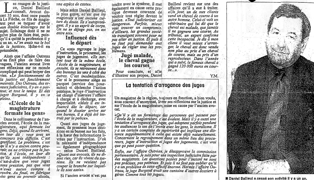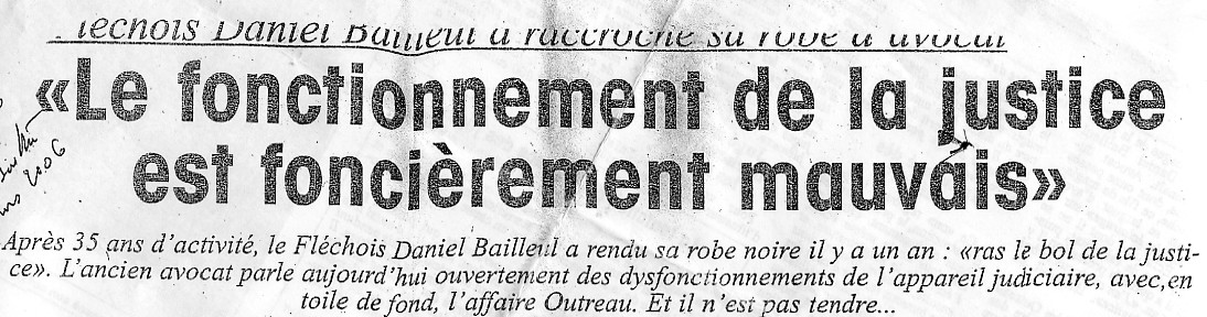 Les rouages de la justice, Daniel Bailleul connaît. Avocat durant 35 ans, dont onze passés à La Flèche, ce fils de magistrat peut se targuer d'avoir « un double éclairage» sur le sujet. Éclairage dont il ne se prive plus de faire état, puisqu'il a quitté la profession il y a un an. « J'en avais ras le bol de la justice », lâche-t-il en préambule. « L'école de la magistrature formate les gens » |