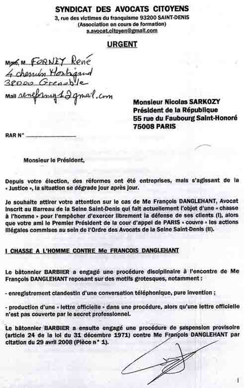 Monsieur le Président, Depuis votre élection, des réformes ont été entreprises, mais s'agissant de la « Justice », la situation se dégrade jour après jour. Je souhaite attirer votre attention sur le cas de Me François DANGLEHANT, Avocat inscrit au Barreau de la Seine Saint-Denis qui fait actuellement l'objet d'une « chasse à l'homme » pour l'empêcher d'exercer librement la défense de ses clients (1), alors que votre ami le Premier Président de la cour d'appel de PARIS « couvre » les actions illégales commises au sein de l'Ordre des Avocats de la Seine Saint-Denis (Il). 1 CHASSE A L'HOMME CONTRE Me FRANCOIS DANGLEHANT Le bâtonnier BARBIER a engagé une procédure disciplinaire à l'encontre de Me François DANGLEHANT reposant sur des motifs grotesques, notamment : - enregistrement clandestin d'une conversation téléphonique, pure invention ; - production d'une « lettre officielle dans une procédure, alors qu'une lettre officielle n'est pas couverte par le secret professionnel. Le bâtonnier `BARBIER a ensuite engagé une procédure de suspension provisoire (article 24 de la loi du 31 décembre 1971) contre Me François DANGLEHANT par citation du 29 avril 2008 (Pièce n ° 1). 1 |