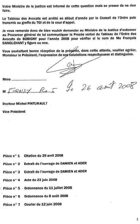 | Votre Ministre de la justice est informé de cette question mais se presse de ne rien faire. Le Tableau des Avocats est arrêté en début d'année par le Conseil de l'Ordre puis transmis au greffe du TGI et de la cour d'appel. Je vous remercie donc de bien vouloir demander au Ministre de la Justice d'ordonner au Procureur général de lui communiquer le Procès verbal du Tableau de l'Ordre des Avocats de BOBIGNY pour l'année 2008 pour vérifier si le nom de Me François DANGLEHANT y figure ou non. Vous souhaitant bonne réception de la présente, dans cette attente, veuillez agréer, Monsieur le Président, l'expression de nos salutations respectueuses et distinguées. Mme .................. ~ .................. Docteur Michel PINTURAULT Vice Président Pièce n° 1. Citation du 29 avril 2008 Pièce n ° 2 Extrait de l'ouvrage de DAMIEN et ADER Pièce n ° 3 Extrait de l'ouvrage de DAMIEN et ADER Pièce n ° 4 Acte du 23 juin 2008 Pièce n ° 5 . Ordonnance du 11 juillet 2008 Pièce n ° 6 Ordonnance du 8 août 2008 Pièce n ° 7 Courier du 12 juin 2008 |