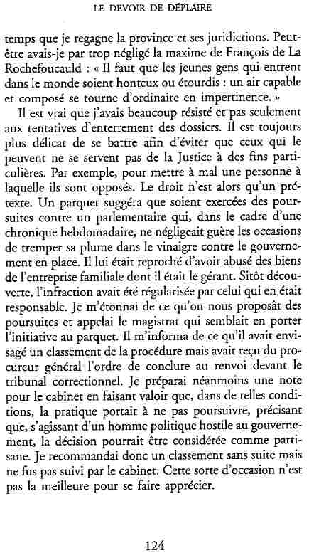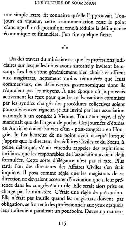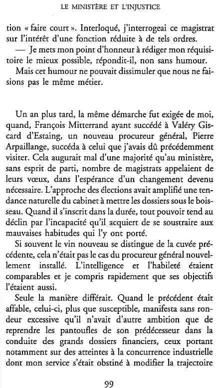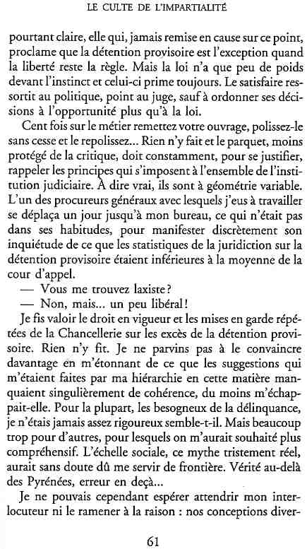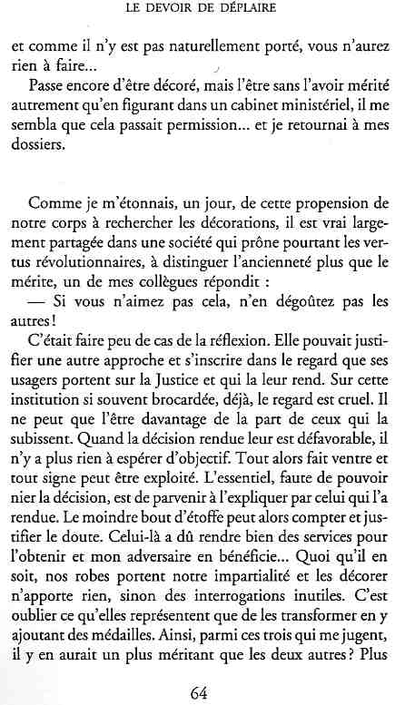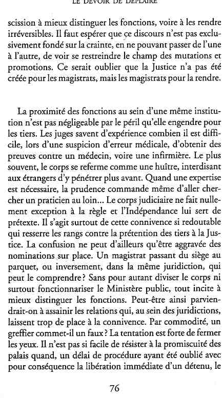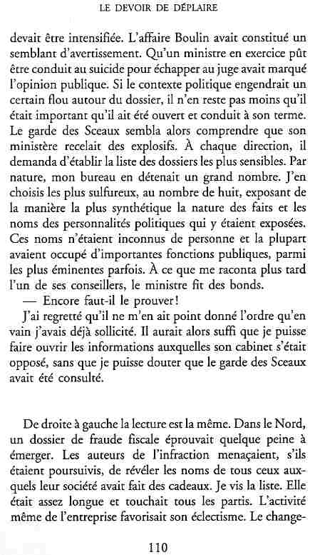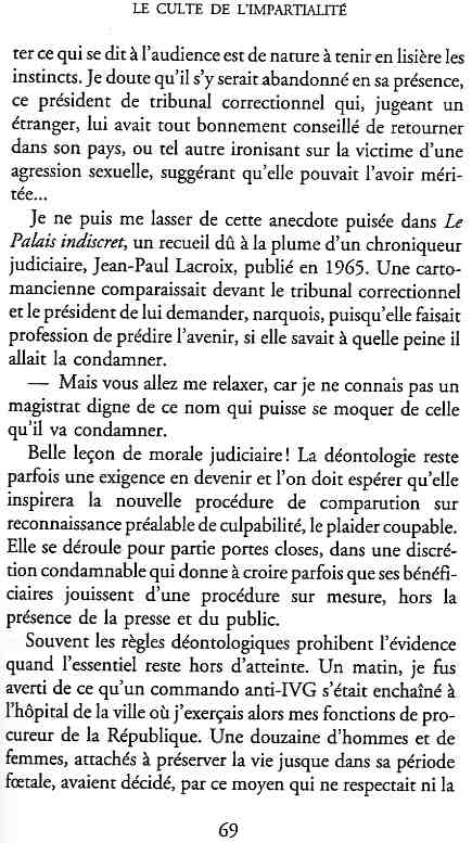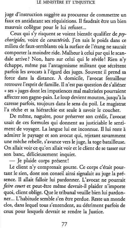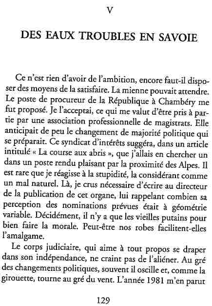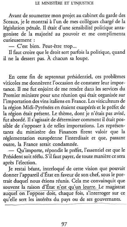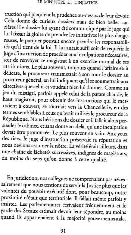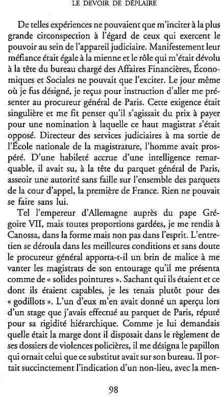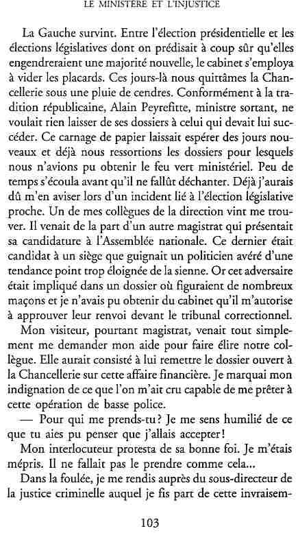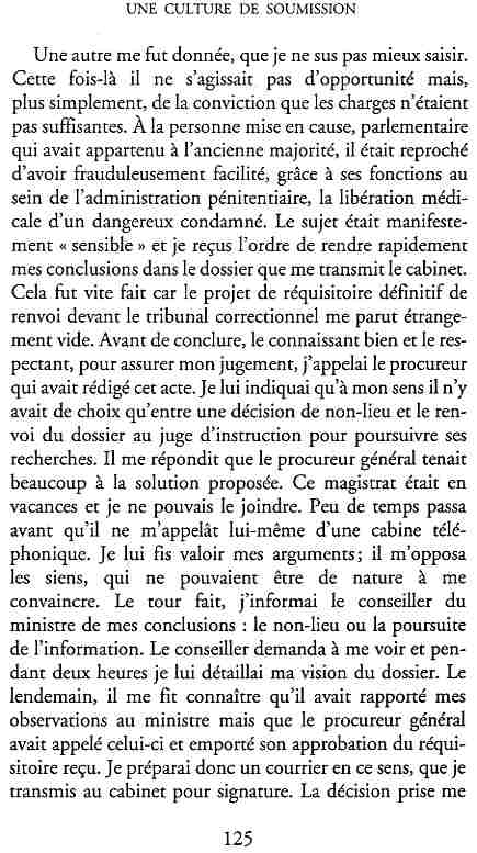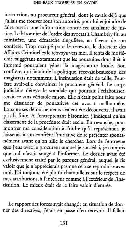 ...P51 Je m'inquiétai de cette entorse à la règle, il répliqua : Qui veut la fin veut les moyens !...p52 ...apparences de la démocratie...p53 pour tirer les leçon d'Outreau, il y faudra un peu plus d'imagination...le corporatisme judiciaire... p54 limiter le rôle du juge...p55Outreau...rapporteur,avocat de surcroît, paraisse s'émouvoir de ce Fabrice Burgaud...p59 Elle s'exprime dans des impératifs statistiques 60, 61 p64... l'ancienneté plus que le mérite, p65 obédiences de la franc-maçonnerie...réputé pour dissimuler ce qui doit l'être...p68 Si nul n'est contraint d'être maçon, nul l'est davantage d'être... p69 le plaider coupable. Elle se déroule pour partie portes closes, dans une discrétion condamnable p76 le corps se referme comme une huitre... Im dépendance lui sert de préteste...connivence...greffier commet-il un faux ? La tentation est forte de fermer les yeux ...p77 juge d'instrustion suggère au procureur de commettre un faux en antidatant ses réquisitions...A domicile, l'avocat férailleur retrouve l'esprit de famille. Il n'est pas question de s'aliénerses juges dont les impatiences mal maîtrisées pourraient affecter son gagne-pain p78 79Parfois la connivence se fait complice, jusqu'à l'humiliation p90 91 juegs d'instruction qui plaçaient la prudence au dessus de leur devoir. Cela donne de curieux dossiers mais de bien belle carrière...96 97 Qu'importe, répondit le préfety, l'essentiel est que le Président soit réélu. S'il faut payer, de toute manière ce sera après l'élection. p98 99 Canossa... je lui demandais quelle marge dont il disposait dans le règlement de ses dossiers de violences polières... indications d'un non-lieu, avec la mention faire court. Interloqué, j'interrogeai ce magistrat sur l'intérêt d'une fonction réduite à de tels ordres...même démarche fut exigée de moi, quand, François Miterrand ayant succédé à Valéry Giscard D'Estaing, un nouveau procureur général, Pierre Arpaillange...ambition de reprendre les pantoufles de son prédécesseur dans la conduite des grands dossiers financiers... p102 Un seul était exclu des poursuites, un médecin... Interloqué... poursuivre ce médecin... le garde des sceaux ne sera pas content... p103 majorité nouvelle, le cabinet s'employa à vider les placard. Cesd jours-là nous quittâmes la Chancellerie sous une pluis de cendre...Alain Peyrefitte, ministre...p110 111 De droite àgauche la lecture est la même.un dossier de fraude fiscale éprouvait queque peine à émerger. Les auteurs de l'infraction menaçaient...phénomène qui ne pouvait que s'accroître... p114 115 ...magistrats... découvertes ghastronomiques...malversations commises par les syndics...p124 125 j'avais beaucoup résisté et pas seulement aus tentatives d'enterrement des dossiers ... p129 130 131 EAUX TROUBLES EN SAVOIE ... procureur de la République à Chambéry tenta de me fléchir...gêner la magistrature locale... dissuader de poursuivre cet avocat malhonnête...