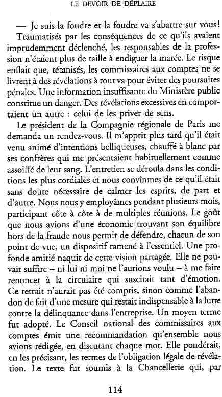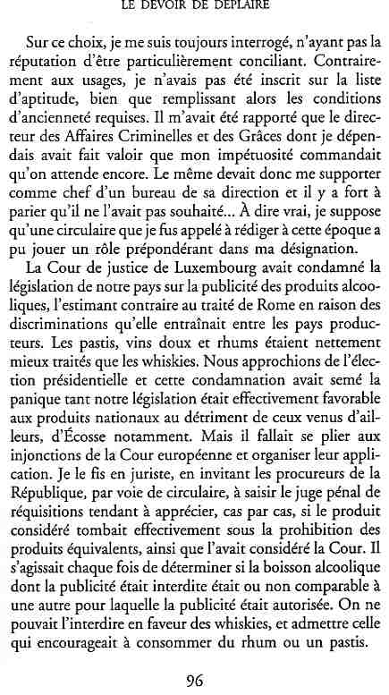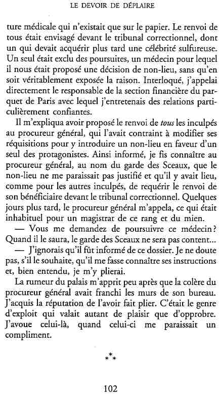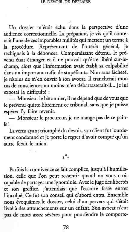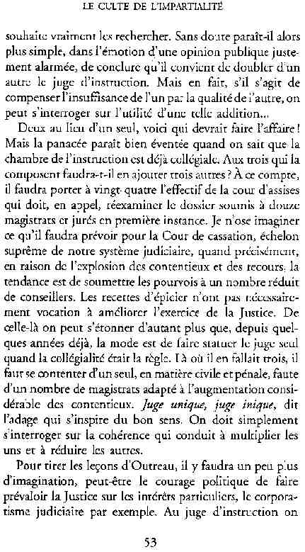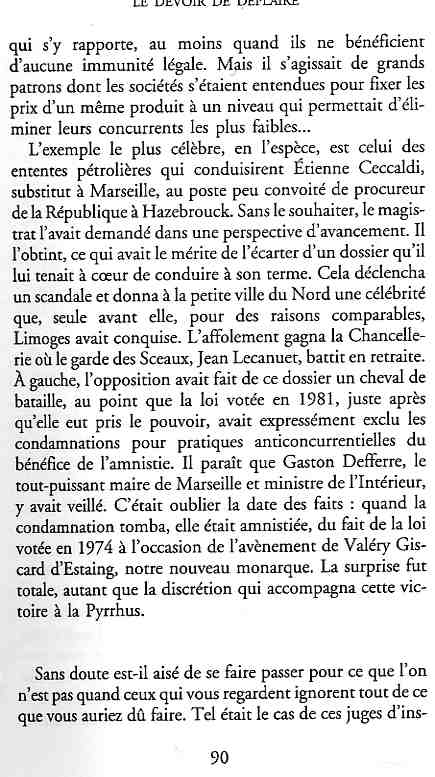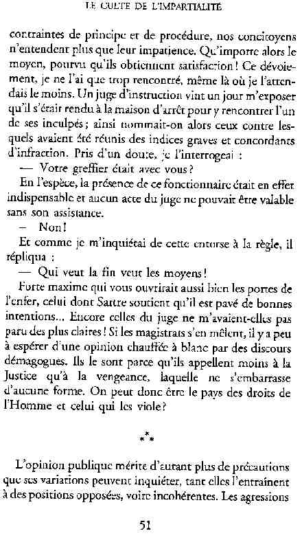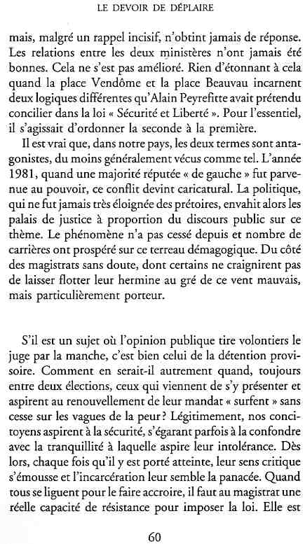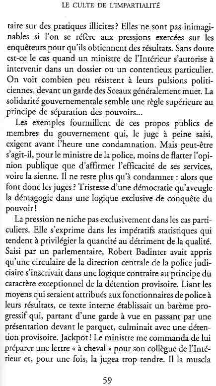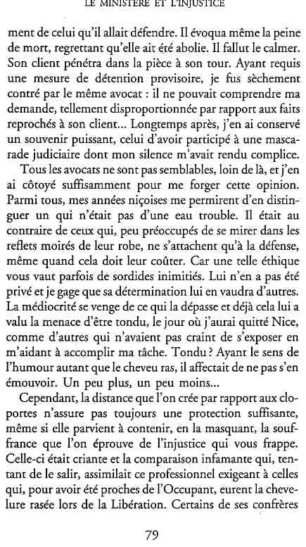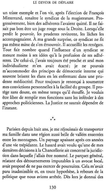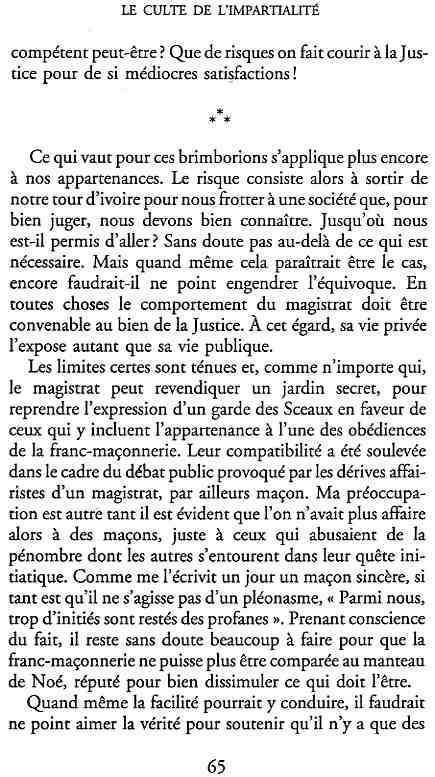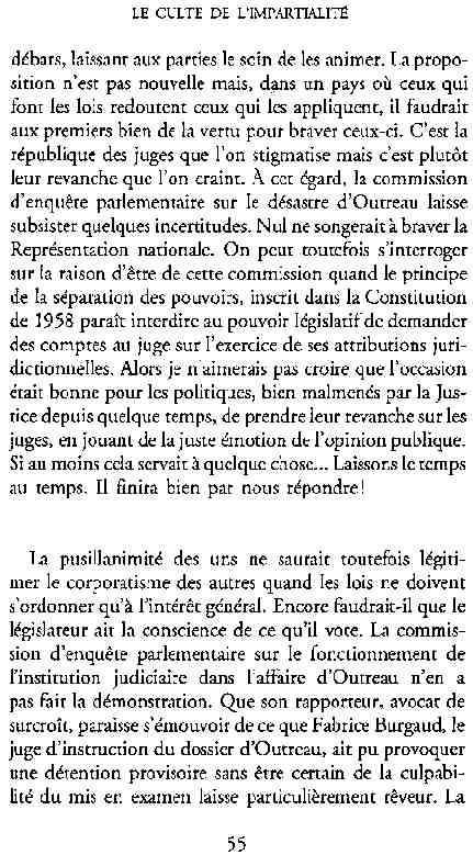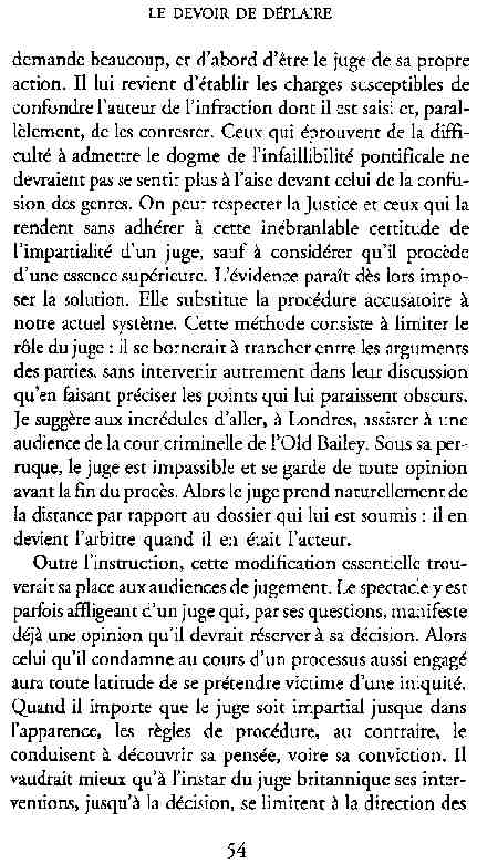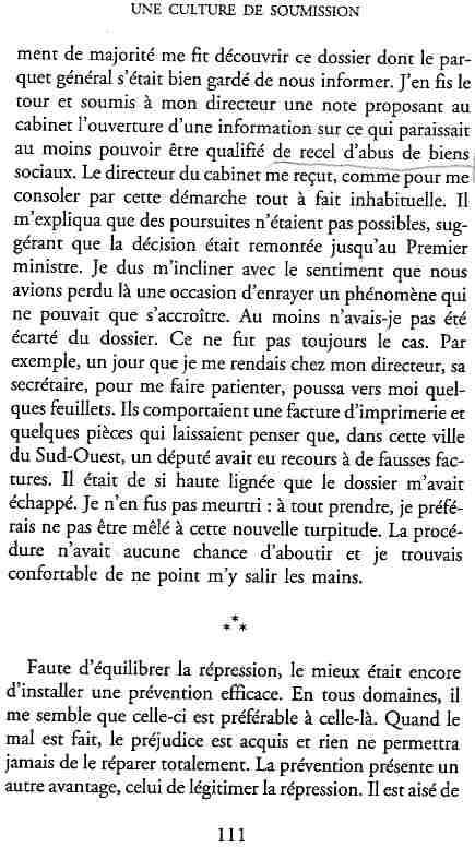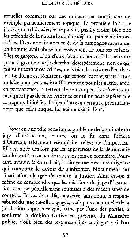 ...P51 Je m'inquiétai de cette entorse à la règle, il répliqua : Qui veut la fin veut les moyens !...p52 ...apparences de la démocratie...p53 pour tirer les leçon d'Outreau, il y faudra un peu plus d'imagination...le corporatisme judiciaire... p54 limiter le rôle du juge...p55Outreau...rapporteur,avocat de surcroît, paraisse s'émouvoir de ce Fabrice Burgaud...p59 Elle s'exprime dans des impératifs statistiques 60, 61 p64... l'ancienneté plus que le mérite, p65 obédiences de la franc-maçonnerie...réputé pour dissimuler ce qui doit l'être...p68 Si nul n'est contraint d'être maçon, nul l'est davantage d'être... p69 le plaider coupable. Elle se déroule pour partie portes closes, dans une discrétion condamnable p76 le corps se referme comme une huitre... Im dépendance lui sert de préteste...connivence...greffier commet-il un faux ? La tentation est forte de fermer les yeux ...p77 juge d'instrustion suggère au procureur de commettre un faux en antidatant ses réquisitions...A domicile, l'avocat férailleur retrouve l'esprit de famille. Il n'est pas question de s'aliénerses juges dont les impatiences mal maîtrisées pourraient affecter son gagne-pain p78 79Parfois la connivence se fait complice, jusqu'à l'humiliation p90 91 juegs d'instruction qui plaçaient la prudence au dessus de leur devoir. Cela donne de curieux dossiers mais de bien belle carrière...96 97 Qu'importe, répondit le préfety, l'essentiel est que le Président soit réélu. S'il faut payer, de toute manière ce sera après l'élection. p98 99 Canossa... je lui demandais quelle marge dont il disposait dans le règlement de ses dossiers de violences polières... indications d'un non-lieu, avec la mention faire court. Interloqué, j'interrogeai ce magistrat sur l'intérêt d'une fonction réduite à de tels ordres...même démarche fut exigée de moi, quand, François Miterrand ayant succédé à Valéry Giscard D'Estaing, un nouveau procureur général, Pierre Arpaillange...ambition de reprendre les pantoufles de son prédécesseur dans la conduite des grands dossiers financiers... p102 Un seul était exclu des poursuites, un médecin... Interloqué... poursuivre ce médecin... le garde des sceaux ne sera pas content... p103 majorité nouvelle, le cabinet s'employa à vider les placard. Cesd jours-là nous quittâmes la Chancellerie sous une pluis de cendre...Alain Peyrefitte, ministre...p110 111 De droite àgauche la lecture est la même.un dossier de fraude fiscale éprouvait queque peine à émerger. Les auteurs de l'infraction menaçaient...phénomène qui ne pouvait que s'accroître... p114 115 ...magistrats... découvertes ghastronomiques...malversations commises par les syndics...p124 125 j'avais beaucoup résisté et pas seulement aus tentatives d'enterrement des dossiers ... p129 130 131 EAUX TROUBLES EN SAVOIE ... procureur de la République à Chambéry tenta de me fléchir...gêner la magistrature locale... dissuader de poursuivre cet avocat malhonnête...