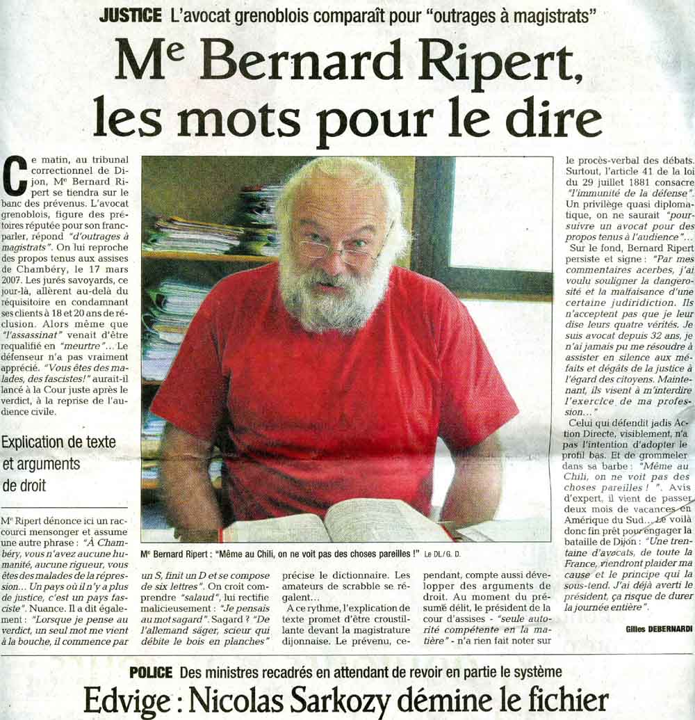 | Ce matin, au tribunal correctionnel de Dijon, Me Bernard Ripert se tiendra sur le banc des prévenus. L'avocat grenoblois, figure des prét oires réputée pour son franc-parler, répond "d'outrages à magistrats". On lui reproche des propos tenus aux assises de Chambéry, le 17 mars 2007. Les jurés savoyards, ce jour-là, allèrent au-delà du réquisitoire en condamnant ses clients à 18 et 20 ans de réclusion. Alors même que "l'assassinat" venait d'être requalifié en "meurtre"... Le défenseur n'a pas vraiment apprécié. "Vous êtes des malades, des fascistes!" aurait-il lancé à la Cour juste après le verdict, à la reprise de l'audience civile. Explication de texte et arguments de droit Me Ripert dénonce ici un raccourci mensonger et assume une autre phrase : "A Chambéry, vous n'avez aucune humanité, aucune rigueur, vous êtes des malades de la répression... Un pays où il n 'y a plus de justice, c'est un pays fasciste ". Nuance. Il a dit également : "Lorsque je pense au verdict, un seul mot me vient à la bouche, il commence par |
