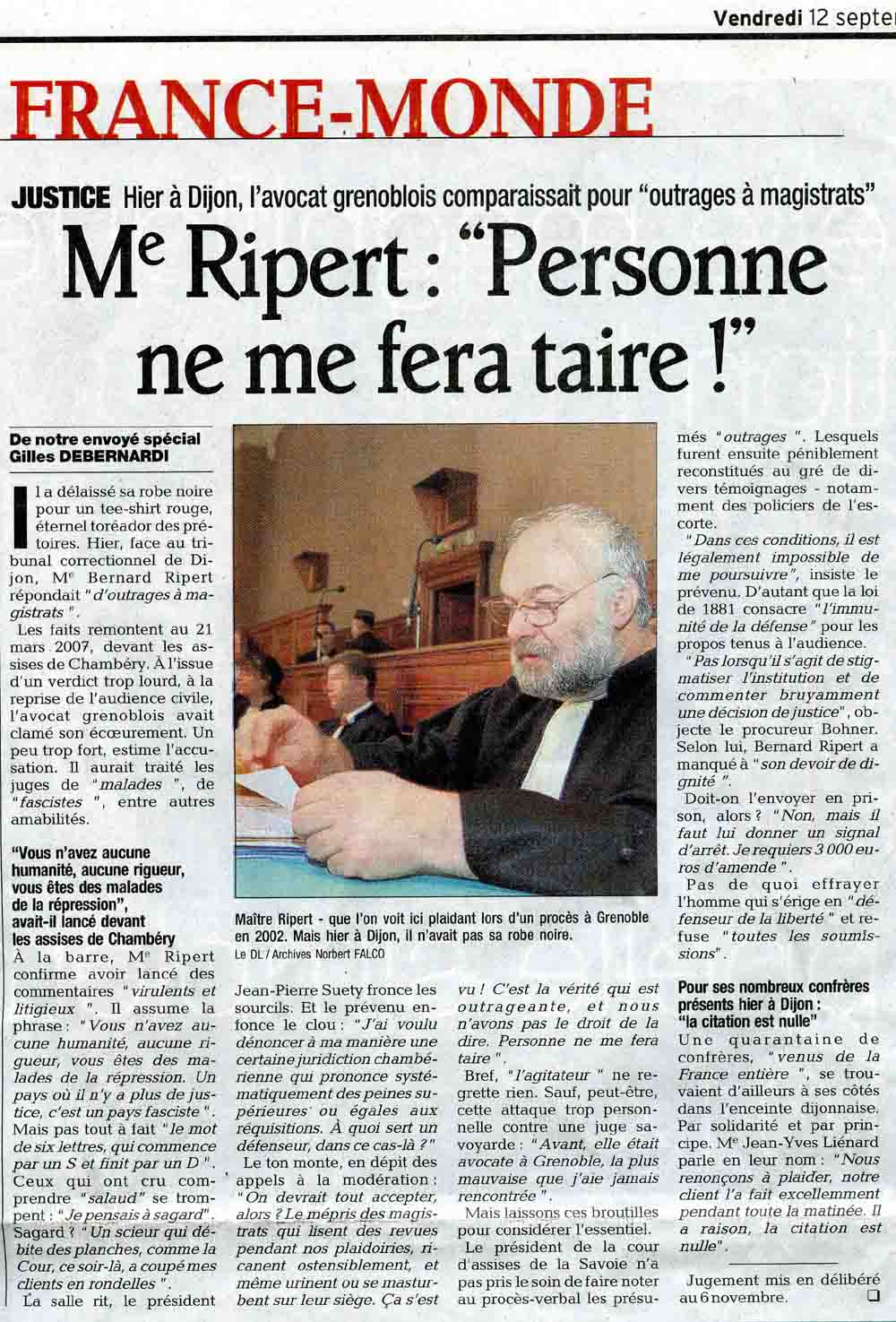 De notre envoyé spécial Gilles DEBERNARDI Il a délaissé sa robe noire pour un tee-shirt rouge, éternel toréador des prétoires. Hier, face au tribunal correctionnel de Dijon, M° Bernard Ripert répondait " d'outrages à mag istrats ". Les faits remontent au 21 mars 2007, devant les ass ises de Chambéry. À l'issue d'un verdict trop lourd, à la reprise de l'audience civile, l'avocat grenoblois avait clamé son écourement. Un peu trop fort, estime l'accusation. Il aurait traité les juges de "malades ", de "fascistes ", entre autres amabilités. avait-il lancé devant les assises de Chambéry À la barre, Me Ripert confirme avoir lancé des commentaires " virulents et litigieux ". Il assume la phrase : "Vous n'avez aucune humanité, aucune rigueur, vous êtes des malades de la répression. Un pays où il n'y a plus de ju s tice, c'est un pays fasciste ". Mais pas tout à fait "le mot de six lettres, qui commence par un Set finit par un D ". Ceux qui ont cru comprendre "salaud" se tromp ent : "Je pensais à sagard" Sagard ? " Un scieur qui déb ite des planches, comme la Cour, ce soir-là, a coupé mes clients en rondelles ". La salle rit, |