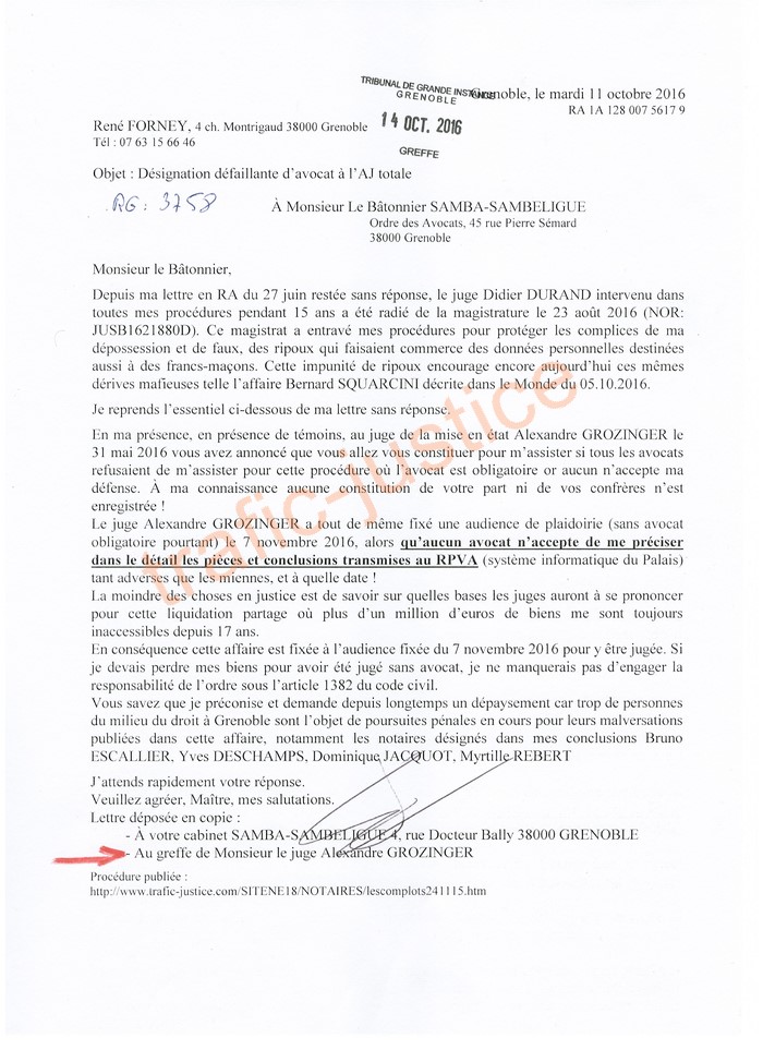 Le juge Alexandre GROZINGER et son comparse le bâtonnier de Grenoble, Wilfried SAMBA SAMBELIGUE ont comploté pour empêcher René FORNEY d'obtenir sa part des biens de la communauté (environ 1,2 millions €) suite à son divorce.