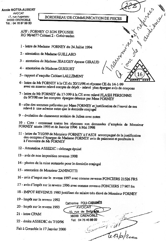 | Accueil Le juge LEGER Jean-Claude truand du réseau ? Pièces jointes aux conclusions d'appel sur une liquidation de communauté à l'origine d'une spoliation par des escrocs en bandes organisées dont des policiers, gendarmes, avocats, avouées, huissiers, experts, notaire, juges ... ? Des preuves ci-après |