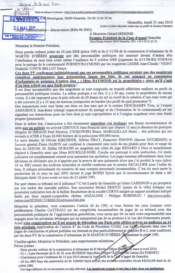 Monsieur le Premier Président, Deux procès verbaux joints du 24 juin 2008 (pièce 109) et du 6/11/08 de la commission d'urbanisme de St MARTIN D'HÈRES prouvent que des personnalités politiques ont annoncé devant d'autres élus l'attribution de mon bien avant même l'audience du 9 octobre 2008 (jugement du 6/11/08-RG 07/03814) pour le partage de la communauté FORNEY/RAYMOND par les magistrats LEGER Jean-Claude / VIGNY Nathalie/ CONTE-BELLOT Denys. Ces deux PV confirment indéniablement que ces personnalités politiques savaient que des magistrats complices entérineraient leur présentation fausse des faits, ils ont annoncé en commission d'urbanisme en présence d'autres élus : « Mme RAYMOND est la propriétaire » alors qu'il s'agit d'un bien acheté sur mes fonds propres ! Il est donc incontestable que des magistrats se sont comportés en truands affairistes mafieux au profit de personnalités politiques locales. La même pratique a eu lieu, il y a 30 ans, contre le propriétaire du terrain voisin. Il a été exproprié pour le prix ridicule de 20 francs du m2 au motif de la création d'une zone verte qui a été couverte (il y a 15 ans) de maisons juxtaposées en bandes (Au profit de quel promoteur ?) Des transactions avec mes biens ont donc eu lieu sans que ni le notaire DESCHAMPS Yves, ni l'expert AMOUROUX Jean-René (chargé respectivement du partage et de l'évaluation de la communauté) ne me signalent ces transactions pour un bien dont je suis copropriétaire et à l'origine acquéreur avec mes fonds propres (personnels). Dans le même but, l'instruction a fait récemment expertiser (en écriture ) une fausse reconnaissance de dette par un policier en activité CERTOUX Jean-François alors que (depuis 12 ans) je dénonce les pratiques illégales de GIRAUD Paul Maurice, CWIKOWSKI Bruno, MARGAILLAN Henri… des policiers qui ont revendu à ATER à Tours 20.000 fichiers de la police pour 600.000 euros. Le mois dernier, M Olivier KIRCHNER, Hélène PIRAT, Françoise SIMOND (épouse DUCHEMIN) et l'avocat général Pierre NAHON ont confirmé le classement sans suite de ma plainte pour faux et usage de faux du 18/01/06. M. Didier DURAND ex magistrat aux côtés du juge RENARD à Nice et actuellement déplacé à Grenoble ainsi que Mme BOURILLE-NOËL Coralie ont participé à cette instruction. Ce rendu judiciaire est manifestement orienté pour permettre ma spoliation. Les juges mentent effrontément dans leurs décisions en déclarant que je n'apporte pas la preuve de mes paiements alors que j'ai produit le reçu (pièce 19 ou 48F) extrait des archives notariales et certifié conforme par le notaire ESCALLIER pour l'achat du bien. Il indique précisément les numéros de mes comptes personnels incontestables. C'est six mois après la production de ce reçu en mai 2005 devant le juge BONIN Sylvie que la reconnaissance de dette a été fabriquée datée 10 jours avant ce reçu du 21 juillet 1981. Par quel réseau ce tribunal est-il influencé ? C'est à partir de Grenoble qu'Alain CARIGNON a pu prospérer par son racket des marchés publics. Son successeur Michel DESTOT (maire de la ville) échappe aux poursuites judiciaires lors de la faillite frauduleuse de la société CORYS malgré un rapport accablant indiqué établi par deux experts comptables Jérôme ANZALONE / Philippe ROBINEAU ! https://www.trafic-justice.com/SITENE17/VEREUX/politiques/liste.htm Monsieur le président, vous connaissez l'article 40 du CPP, si vous fermez les yeux (comme votre prédécesseur Charles CATTEAU) sur les complicités incontestables de juges de ce tribunal avec des personnalités politiques de l'agglomération grenobloise, vous savez que tôt ou tard votre responsabilité sera engagée pour les prochains dérapages qui ne manqueront pas de se produire à la vue des évènements passés. Aussi vous comprendrez qu'il est urgent de délocaliser sur Paris cette affaire prévue en audience au 14 juin prochain (application de l'article 47 du Code de Procédure Civile). Les trafics exposés dans mes 44 pages de conclusions et pièces publiées sur Internet et plus particulièrement le chapitre B-e-1, sont confirmés par les deux PV de la commission d'urbanisme de St MARTIN D'HÈRES (notamment la pièce 109). Veuillez agréer, Monsieur le Président, mes respectueuses salutations. Pièces jointes : Une large diffusion de ces documents est déjà effectuée. Les magistrats truands n'ont rien à faire dans nos institutions