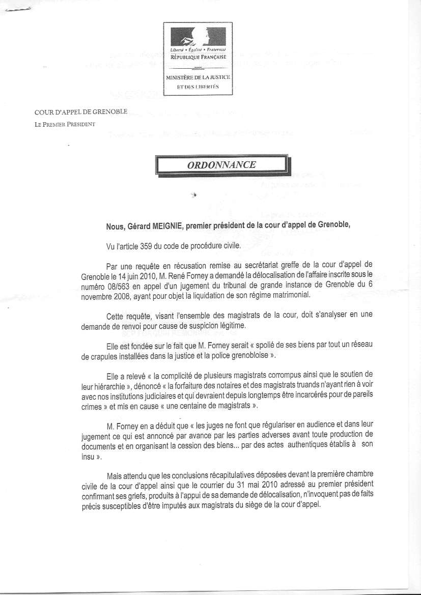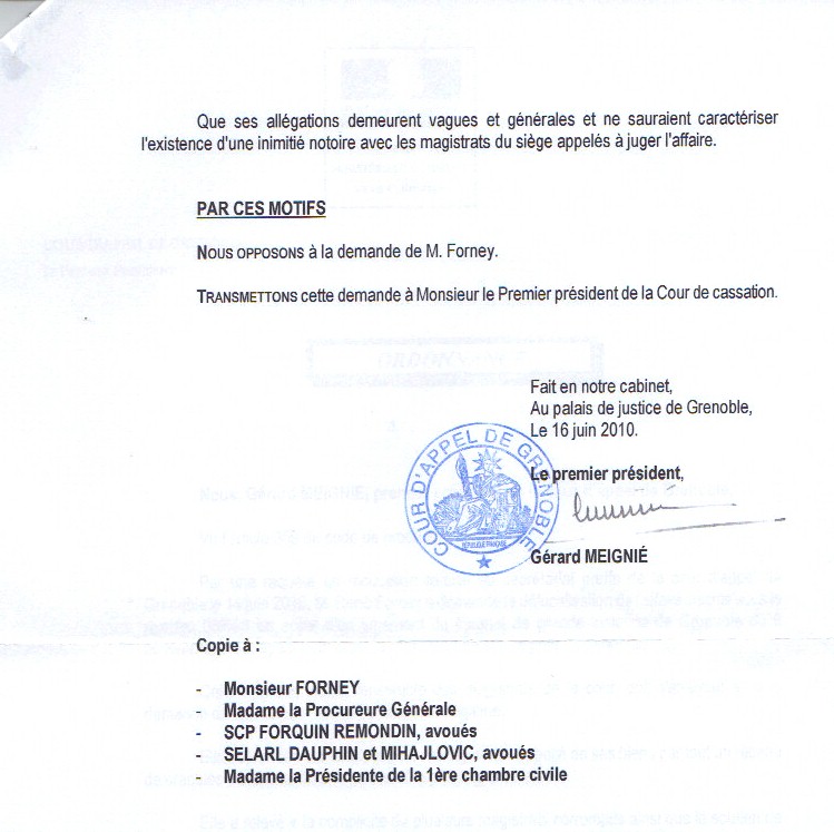Demande et pièces à l'adresse : https://www.trafic-justice.com/SITENE18/appelcivil/premierpresidentdelocalise.htm MEIGNIE Gérard, le juge modèle BURGAUD PARFAIT, les œillères totales, que du dénigrement, aucune discussion sur les pièces présentées avec la première demande ni avec la deuxième. Le parfait truand complice et protecteur de l'affairisme mafieux qui règne dans le tribunal de Grenoble Le parti pris de sa réponse confirme qu'il est indispensable de délocaliser l'affaire. La partialité est ici évidente.