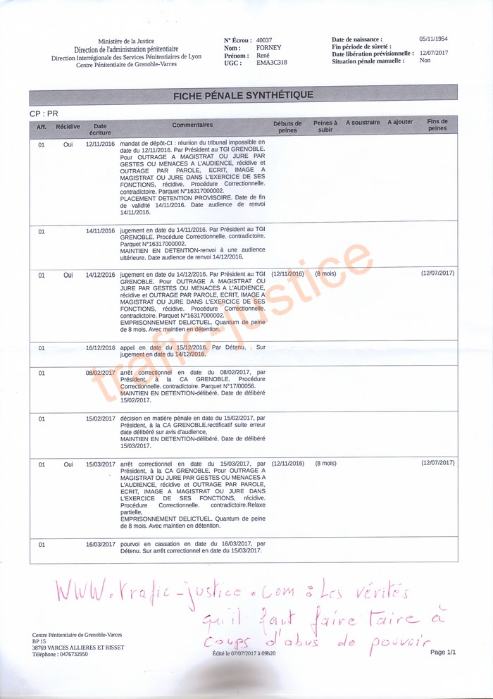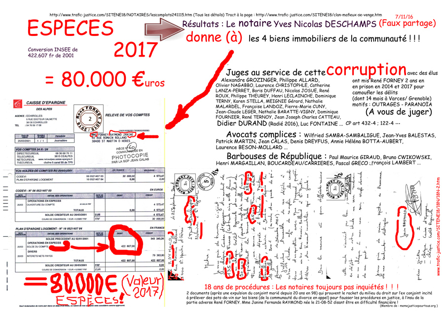 1 - Le juge Alexandre GROZINGER (qui a prétendu être outragé, et, a sollicité ses collègues pour une condamnation aux huit mois de prison fermes effectués par M. FORNEY avec un jour supplémentaire) n'a simplement pas apprécié que M. FORNEY insiste pour que ses 47 pages de conclusions et pièces soient produites par l'avocat Wilfried SAMBA-SAMBELIGUE qui venait les mains vide à l'audience du 7 novembre 2016 en annonçant devant 5 témoins qu'il allait se désister après s'être auto désigné 10 jours avant l'audience du jugement du partage en conservant en son étude les deux jeux conclusions qu'il avait en dépose de M. FORNEY. Permettant ainsi à la partie adverse de faire valider sans contradictoire un faux partage établi par les notaires (au dos) ensuite d'encaissements de fonds conséquents de la partie adverse après un débit en espèces de 80.000 euros (Valeur 2017 selon calcul INSEE) prouvés par le relevé bancaire. Après six lettres recommandée l'avocat W S-S produira son enregistrement de l'appel du jugement GROZINGER du 9 janvier 2017 suivi le 22 juin 2016 d'un examen de caducité parce qu'il n'a pas été dénoncé à la partie adverse. Une méthode de plus pour valider l'entrave à la justice.
