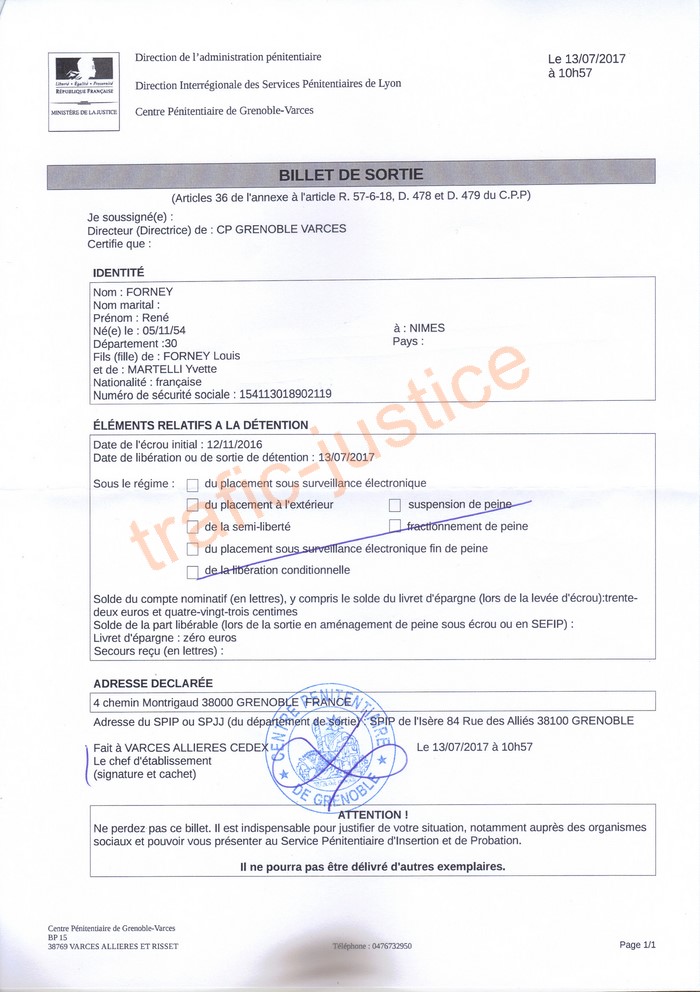Alors que M. FORNEY a été libéré le 13 juillet à 10h30 après un jour supplémentaire aux huit mois de détention arbitraires sans aucune remise de peine, ni parloir accepté, ni numéro de téléphone accepté,