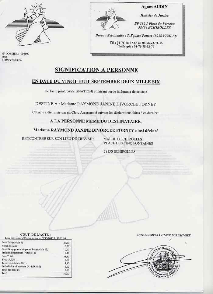 Retour ASSIGNATION EN REFERE au 11 octobre 2006 pour récuser l'expert Jean Réné AMOUROUX sourd, aveugle et auteur de faux en écriture