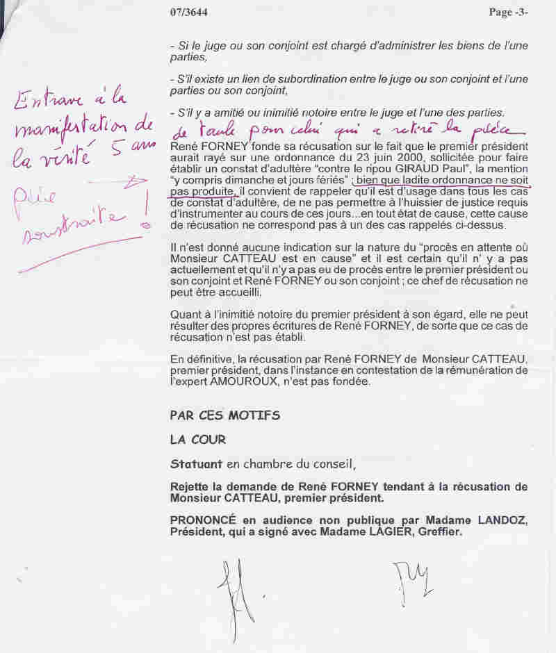 2007, la juge LANDOZ corrompue dans le réseau des mafieux du tribunal de Grenoble protège l'autre truand Charles CATTEAU Premier Président de la Cour d'appel qui a déjà entravés la manifestation de la vérité dans l'affaire. Il a refusé sa récusation et étrangement la pièce de sa main disparaît du dossier du juge LANDOZ ! ! Récidive ! Et le juge l'écrit : " bien que la dite ordonnance ne soit pas produite" (qui a donc soustrait l'ordonnance pour protéger le juge mafieux ?) |