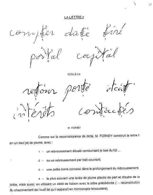 La partie adverse persiste à valider un de ses faux : Une reconnaissance de dette prétexte à contourner le reçu du notaire de famille concernant l'achat de la maison sur les fonds propres (personnels) de René FORNEY en 1980, à qui ce bien appartient. Le juge demande à un expert faussaire de confirmer ce que j'ai dit : " qu'il s'agit de mon écriture et de ma signature", mais personne ne cherche à savoir si le contenu est possible, ni même les déclarations farfelues qui y sont écrites, ni même comment le document a été fabriqué. (Voir l'appel de cette instruction et mes conclusions)