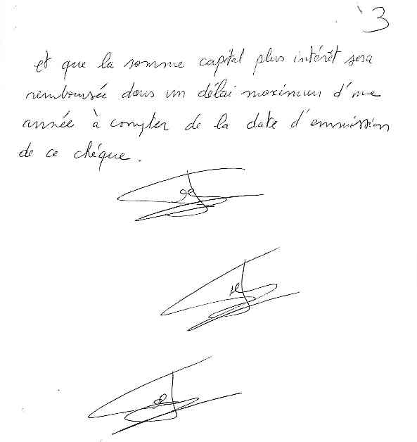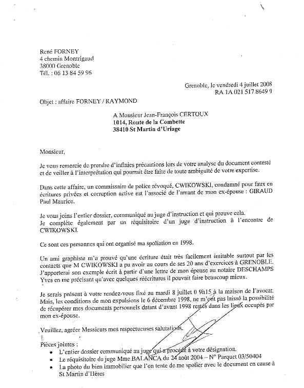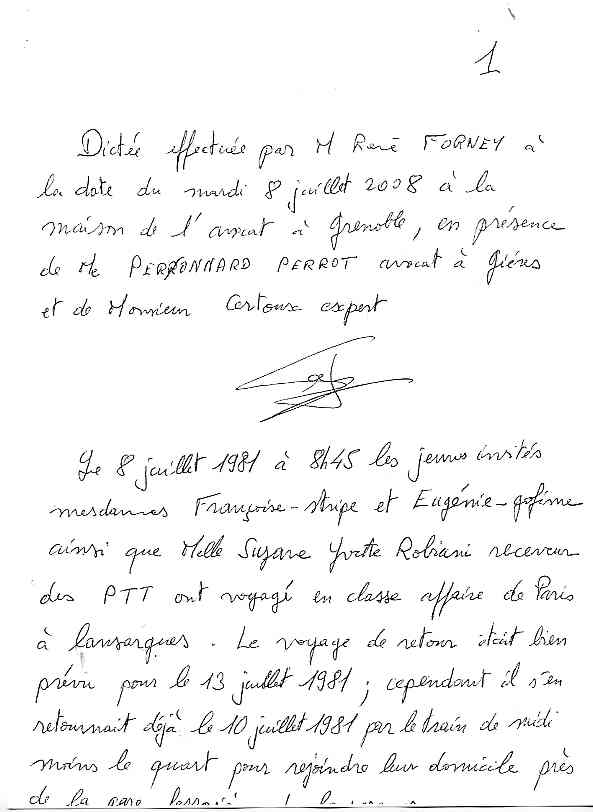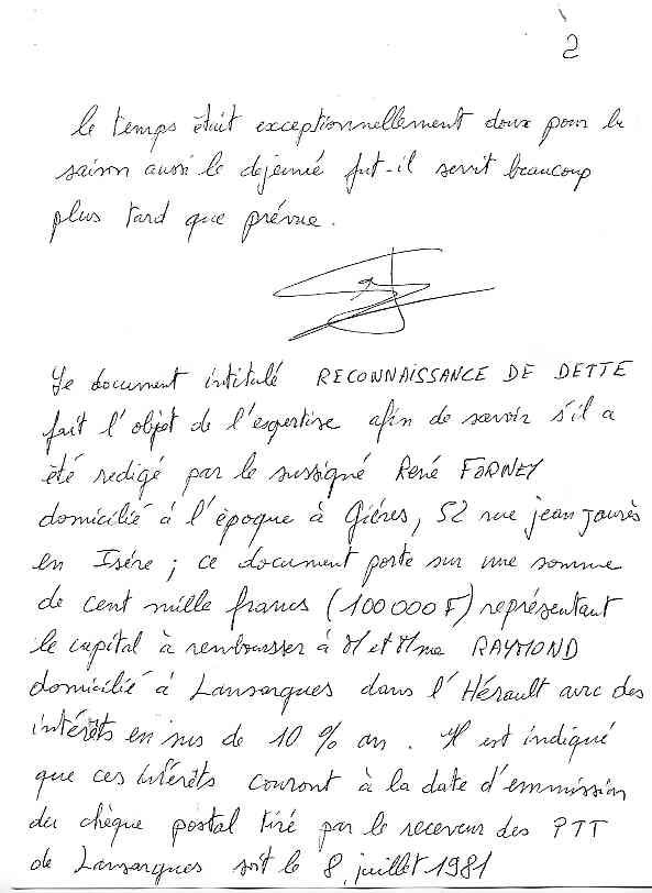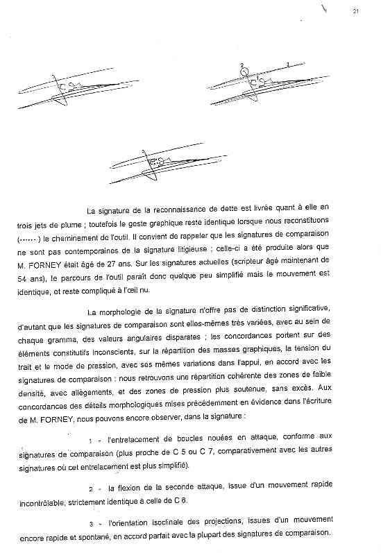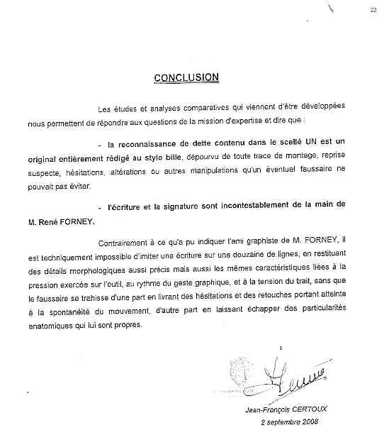 La partie adverse persiste à valider un de ses faux : Une reconnaissance de dette prétexte à contourner le reçu du notaire de famille concernant l'achat de la maison sur les fonds propres (personnels) de René FORNEY en 1980, à qui ce bien appartient. Le juge demande à un expert faussaire de confirmer ce que j'ai dit : " qu'il s'agit de mon écriture et de ma signature", mais personne ne cherche à savoir si le contenu est possible, ni même les déclarations farfelues qui y sont écrites, ni même comment le document a été fabriqué. (Voir l'appel de cette instruction et mes conclusions)