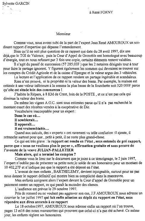 J'ai aussi observé la collusion de l’expert AMOUROUX avec des notaires « escrocs » . C'est constaté par d’autres justiciables dont Sylvette GARCIN au sujet du détournement d'un héritage. Elle joint son témoignage ci-dessous :