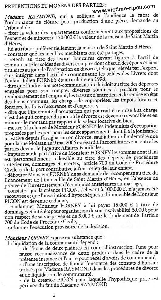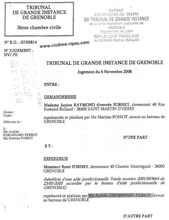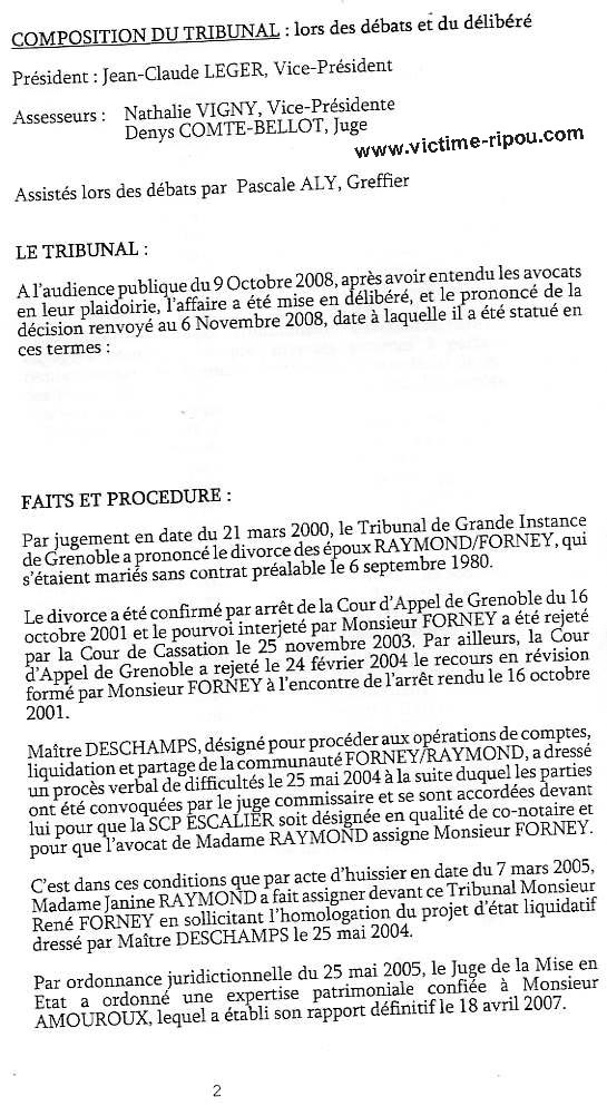 Comme pour les milliers de tutelles, depuis 10 ans, je suis TOTALEMENT dépossédé de l'essentiel de mes biens. La gangrène de la justice par certains juges affairistes du tribunal de Grenoble ont rendu le jugement ci-dessous. Le magistrat LEGER Jean-Claude confirme ainsi sa complicité avec les ripoux ! Comment le juge LEGER peut-il se sentir si puissant pour pouvoir considérer que le reçu du notaire ESCALLIER justifiant du paiement sur mes deniers personnels de ma maison, et, extrait des archives notariales, ne puisse constituer une preuve de mon paiement sur fonds propres et me déposséder de mon bien ? La lettre du notaire de la famille depuis 1980, accompagnée de la jurisprudence de cassation, dénonçant le scandale est pourtant entre ses mains ! Comment le juge LEGER peut-il valider des avoirs bancaires de 50.000 € présentés par mon ex épouse à une date unique fixée par elle, alors qu'il a en main les preuves qu'elle a dépensé 112.000 € en 6 mois suivant ses déclarations ? J'ai pourtant demandé à plusieurs reprises à l'expert et aux juges que les comptes soient examinés avant et après la date de la présentation par mon ex épouse pour prouver la mystification et sa préparation de relevés factices juste pour la date du divorce. Il faut rappeler le début des trafics : Au lieu de demander un report comme cela se pratique en pareille circonstance, on peut lire dans la lettre de mon avocate au début de cette affaire devant le JAF :