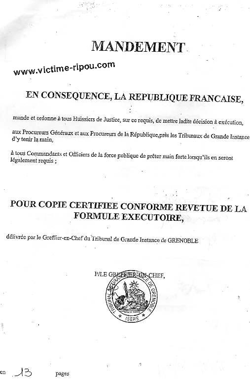 Comme pour les milliers de tutelles, depuis 14 ans, je suis TOTALEMENT dépossédé de l'essentiel de mes biens. En rendant le jugement ci-dessous, le magistrat truand Jean-Claude LEGER confirme ainsi sa complicité avec les ripoux ! Comment le juge LEGER peut-il se sentir si puissant pour pouvoir considérer que le reçu du notaire ESCALLIER justifiant du paiement sur mes deniers personnels de ma maison, et, extrait des archives notariales, ne puisse constituer une preuve de mon paiement sur fonds propres et me déposséder de mon bien ? La lettre du notaire de la famille depuis 1980, accompagnée de la jurisprudence de cassation, dénonçant le scandale est pourtant entre ses mains ! Comment le juge LEGER peut-il valider des avoirs bancaires de 50.000 € présentés par mon ex épouse, à une date unique fixée par elle, alors qu'il a en main les preuves qu'elle a dépensé 112.000 € en 6 mois suivant ses déclarations ? J'ai pourtant demandé à plusieurs reprises à l'expert et aux juges que les comptes soient examinés avant et après la date de la présentation par mon ex épouse pour prouver la mystification et sa préparation de relevés factices juste pour la date du divorce. Il faut rappeler le début des trafics : Au lieu de demander un report comme cela se pratique en pareille circonstance, on peut lire dans la lettre de mon avocate au début de cette affaire devant le JAF :