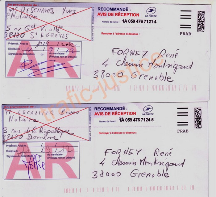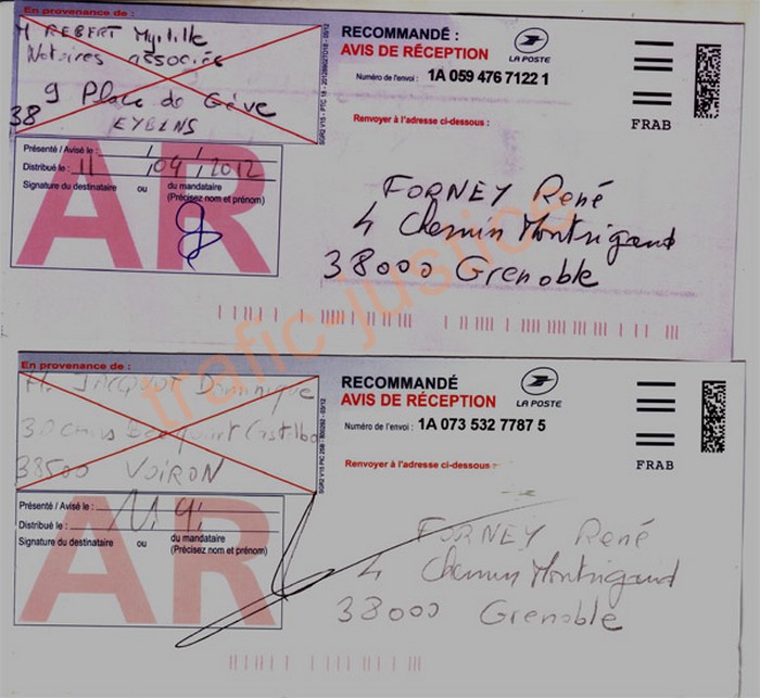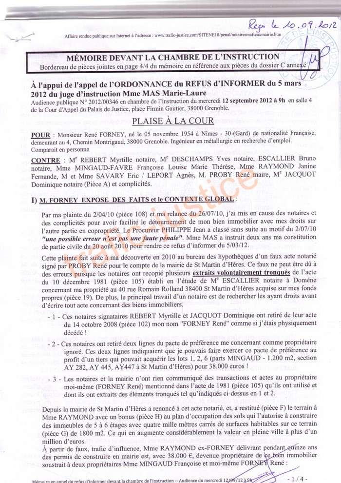 MÉMOIRE DEVANT LA CHAMBRE DE L'INSTRUCTION À l'appui de l'appel de l'ORDONNANCE du REFUS d'INFORMER du 5 mars 2012 du juge d'instruction Mme MAS Marie-Laure PLAISE À LA COUR POUR : Monsieur René FORNEY, né le 05 novembre 1954 à Nîmes - 30-(Gard) de nationalité Française, demeurant au 4, Chemin Montrigaud, 38000 Grenoble. Ingénieur en métallurgie en recherche d'emploi. CONTRE : Me REBERT Myrtille notaire, Me DESCHAMPS Yves notaire, ESCALLIER Bruno notaire, Mme MINGAUD-FAVRE Françoise Louise Marie Thérèse, Mme RAYMOND Janine Fernande, M et Mme SAVARY Eric / LEPORT Agnès, M. PROBY René maire, Me JACQUOT Dominique notaire (Pièce A) et complicités. I M. FORNEY EXPOSE DES FAITS et le CONTEXTE GLOBAL : Par ma plainte du 2/04/10 (pièce 108) et ma relance du 26/07/10, j'ai mis en cause des notaires et des complicités pour avoir facilité le détournement de mon bien immobilier avec mes droits sur l'autre partie en copropriété. Le Procureur PHILIPPE Jean a classé sans suite au motif du 2/07/10 "une possible erreur n'est pas une faute pénale" . Mme MAS a instruit deux ans ma constitution de partie civile du 20 août 2010 pour rendre ce refus d'informer du 5/03/12. Cette plainte fait suite à ma découverte en 2010 au bureau des hypothèques d'un faux acte notarié signé par PROBY René pour le compte de la mairie de St Martin d'Hères. Ce faux ne peut être dû à des erreurs puisque les notaires ont recopié plusieurs extraits volontairement tronqués de l'acte du 10 décembre 1981 (pièce 105) établi en l'étude de Me ESCALLIER notaire à Domène concernant ma propriété au 40 rue Romain Rolland 38400 St Martin d'Hères acquise sur mes fonds propres (pièce 19). De plus, le principal travail d'un notaire est de rechercher les ayant droits avant d'écrire tout acte concernant des biens immobiliers.