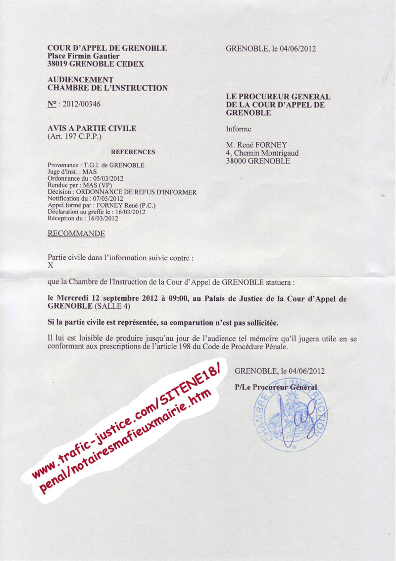 Messieurs, Mesdames, Par application de l'article 198 du CPP, je vous informe, que pour la procédure pénale dans laquelle vous êtes mis en cause pour faux, usage de faux, trafic d'influence, corruption, détournements de biens., est à votre disposition au greffe de la chambre de l'instruction de la cour d'appel de Grenoble, à partir du lundi 10 septembre 2012, mon mémoire et pièces devant la chambre de l'instruction pour l'affaire venant en audience le mercredi 12 septembre 2012 à 9h (convocation annexée) Ce mémoire sera aussi, intégralement, le même jour, publié sur Internet à l'adresse : Veuillez agréer mes salutations. Page 1/2 |