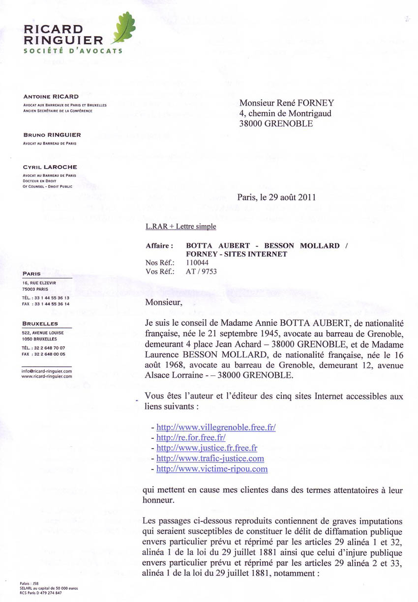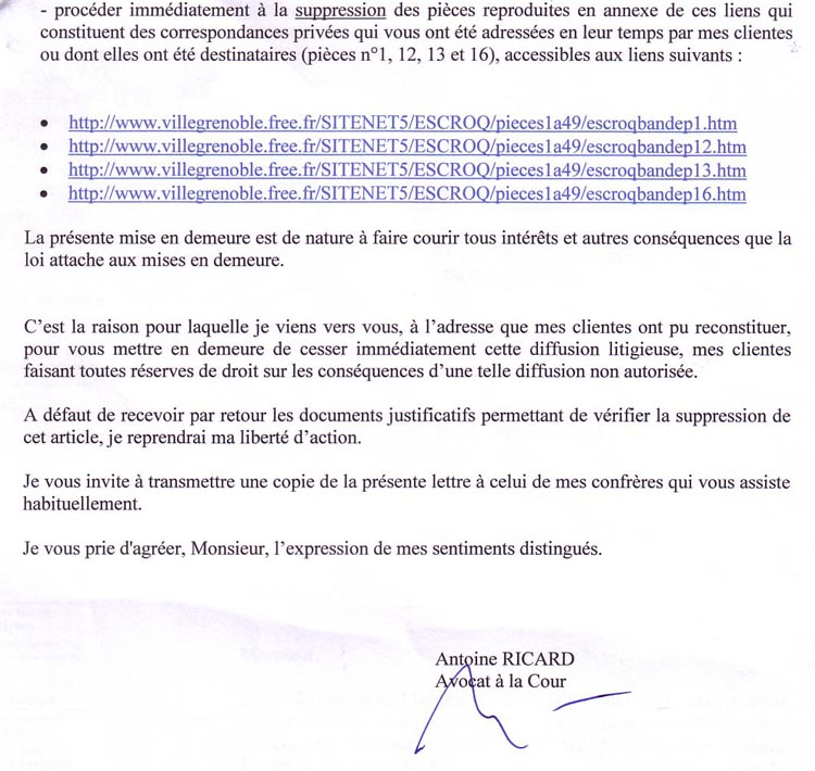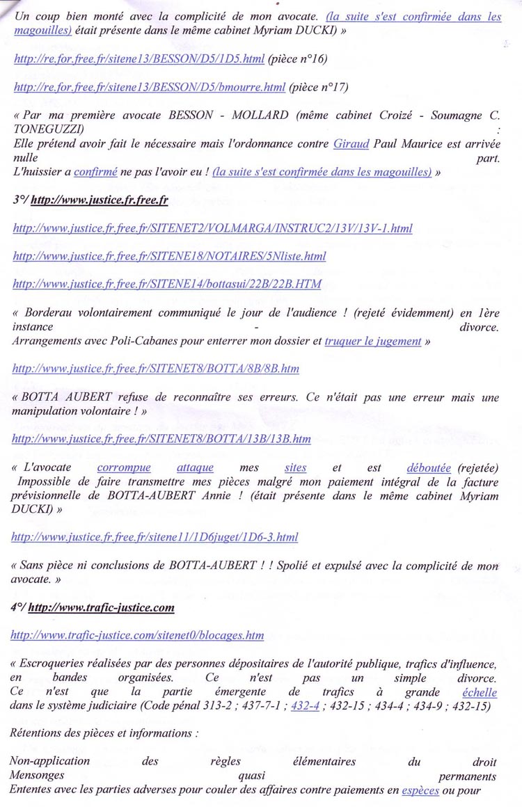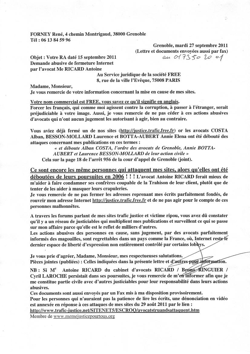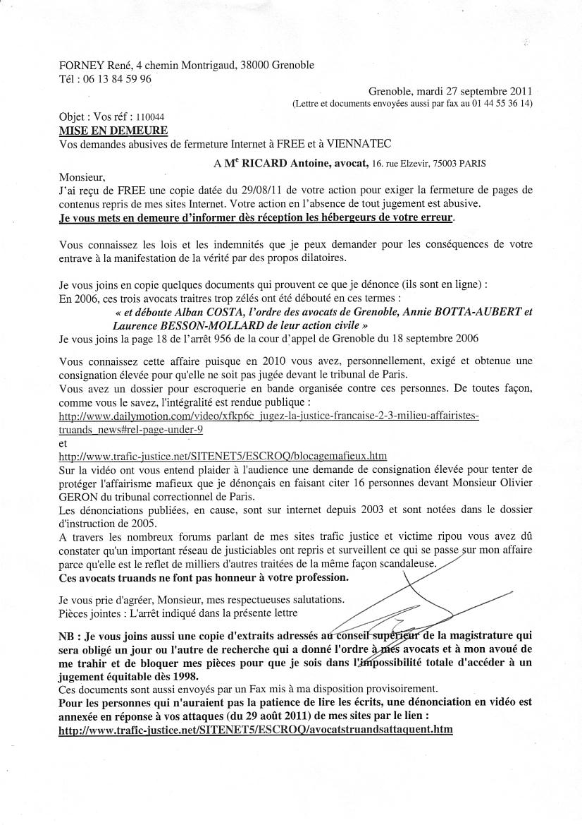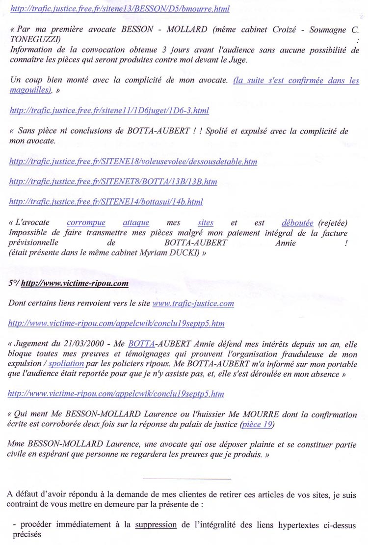 Monsieur, J'ai reçu de FREE une copie datée du 29/08/11 de votre action pour exiger la fermeture de pages de contenus repris de mes sites Internet. Votre action en l'absence de tout jugement est abusive. Je vous mets en demeure d'informer dès réception les hébergeurs de votre erreur . Je vous joins en copie quelques documents qui prouvent ce que je dénonce (ils sont en ligne) : En 2006, ces trois avocats traitres trop zélés ont été débouté en ces termes : Vous connaissez cette affaire puisque en 2010 vous avez, personnellement, exigé et obtenue une consignation élevée pour qu'elle ne soit pas jugée devant le tribunal de Paris. Les dénonciations publiées, en cause, sont sur internet depuis 2003 et sont notées dans le dossier d'instruction de 2005. A travers les nombreux forums parlant de mes sites trafic justice et victime ripou vous avez dû constater qu'un important réseau de justiciables ont repris et surveillent ce qui se passe sur mon affaire parce qu'elle est le reflet de milliers d'autres traitées de la même façon scandaleuse. Je vous prie d'agréer, Monsieur, mes respectueuses salutations. Pièces jointes : L'arrêt indiqué dans la présente lettre NB : Je vous joins aussi une copie d'extraits adressés au conseil supérieur de la magistrature qui sera obligé un jour ou l'autre de recherche qui a donné l'ordre à mes avocats et à mon avoué de me trahir et de bloquer mes pièces pour que je sois dans l'impossibilité totale d'accéder à un jugement équitable dès 1998. |