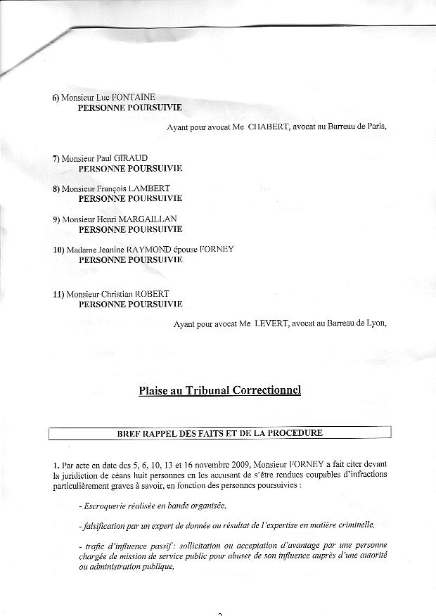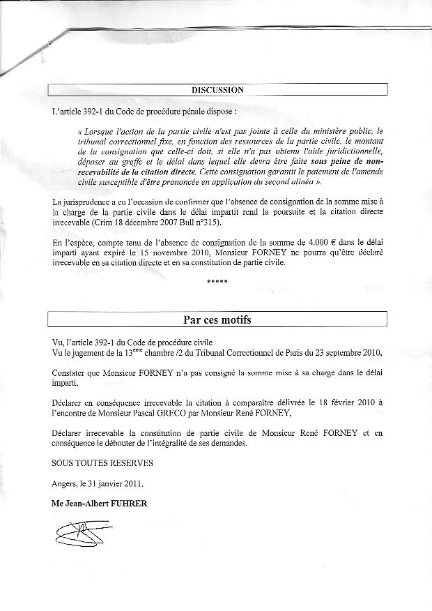 René FORNEY, 4 ch. Montrigaud, 38000 Grenoble Grenoble le jeudi 21 octobre 2010 Objet : Mise sous séquestre ou autre mesure en urgence. Tribunal Correctionnel - 13 ème chambre, 2 section - 4 Bd du Palais, 75004 PARIS À Monsieur Olivier GERON, Président de l'audience correctionnelle du 23 sept. 2010. Motif de l'intervention A - Par décision en audience du 23 septembre 2010 devant la 13 e Chambre 2 e Section du Tribunal correctionnel de Paris, Monsieur le juge GERON Olivier a fixé une consignation à 4.000 € à verser avant le 15 novembre 2010 (Affaire N° 0930108071) malgré ma situation au RSA depuis plusieurs années, malgré mes justificatifs (pièce 201) de 400 € de revenu mensuel . De plus, Monsieur le juge GERON me demande de faire citer à nouveau les absents pour le report au 3 février 2011. B - Je réaffirme être dans l'impossibilité de verser, avant le 15 novembre, cette consignation avec mes moyens connus à ma disposition car ma liquidation de communauté est toujours pendante devant la Cour d'appel de Grenoble (pièce 202).