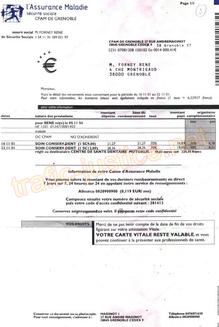 3 - Remboursement sécu de soins dentaires de 2001 avec l'adresse de M. FORNEY.