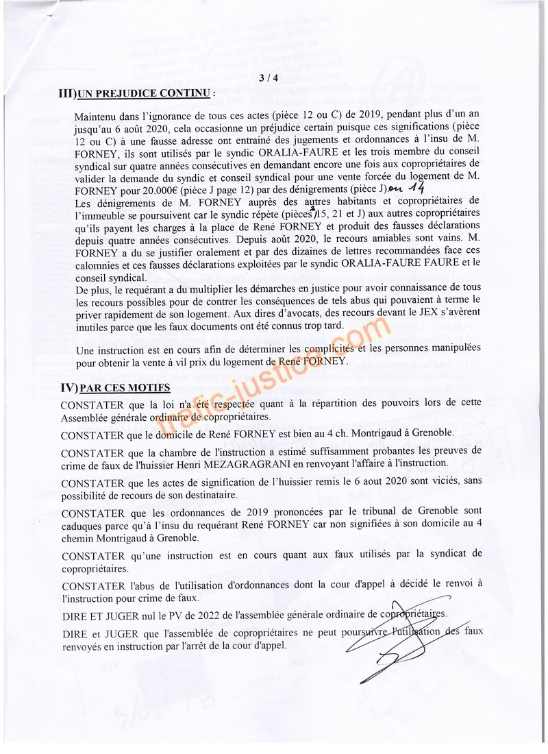 Maintenu dans l'ignorance de tous ces actes (pièce 12 ou C) de 2019, pendant plus d'un an jusqu'au 6 août 2020, cela occasionne un préjudice certain puisque ces significations (pièce 12 ou C) à une fausse adresse ont entrainé des jugements et ordonnances à l'insu de M. FORNEY, ils sont utilisés par le syndic ORALIA-FAURE et les trois membre du conseil syndical sur quatre années consécutives en demandant encore une fois aux copropriétaires de valider la demande du syndic et conseil syndical pour une vente forcée du logement de M. FORNEY pour 20.000€ (pièce J page 12) par des dénigrements (pièce J).
