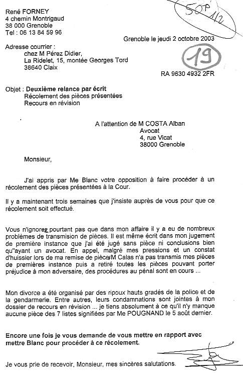 | Relance à mon avocat COSTA Alban, pour obtenir un inventaire des pièces de mon dossier de recours en révision. Voir relance suivante Un avocat choisi par l'AJ dans le cabinet de la partie adverse ! |