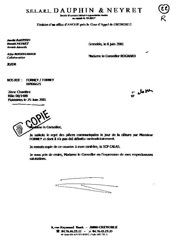| L'avoué adverse (Dauphin & Neyret) demande au conseiller M ROGNARD Yolande le rejet des pièces communiquées (encore une fois !) le jour de la cloture (5 juin 2001) par mon avoué Jean CALAS. Pièce découverte le 22 juillet 2004, dans le dossier du greffe, communiquée par lettre du 2 sept 2004. |