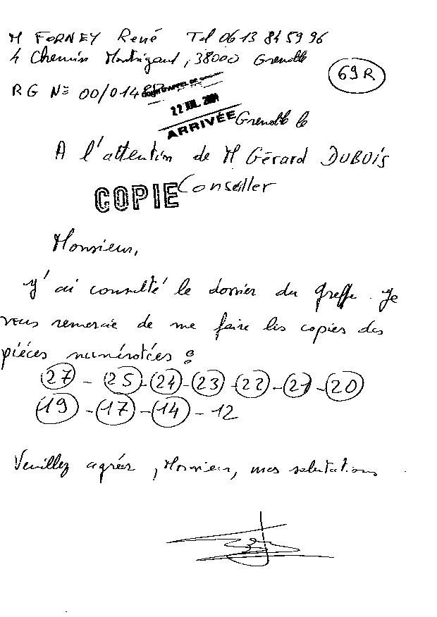 Lettre de M FORNEY pour obtenir des copies (suite au refus de la greffière)