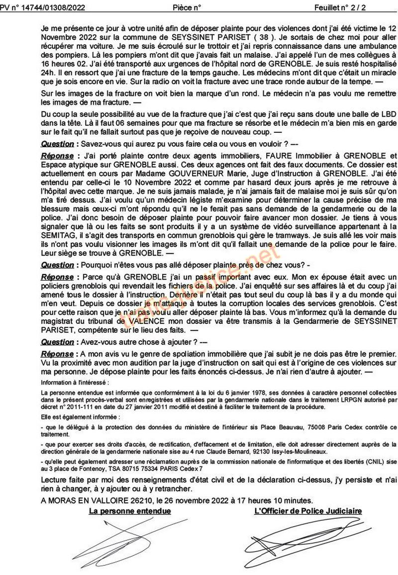 | Voir signalement IGPN / Pour un gendarme de Seyssinet-Pariset d'avoir tenté de dissimuler et faire disparaitre les preuves d'un crime, c'est très grave - Après une heure de palabres, il a fini par faire écrire à Coraline BLAMCHOT une plainte sabotée que j'ai du refaire enregistrer dans la Drôme à Moras-en-Valoire par Madame le Maréchal des Logis-Chef Cindy CHEVALIER - Obéir à un ordre que l'on sait illégal, c'est trois ans de prison ! Art 40 du CCP ?